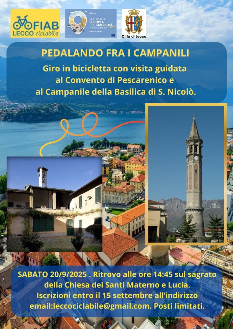 Tour urbano in bicicletta da Pescarenico al centro città volto alla valorizzazione del patrimonio architettonico di Lecco. In particolare saranno descritti i campanili della chiesa di Pescarenico e il campanile della basilica di S. Nicolò sul quale si salirà guidati da una volontaria.