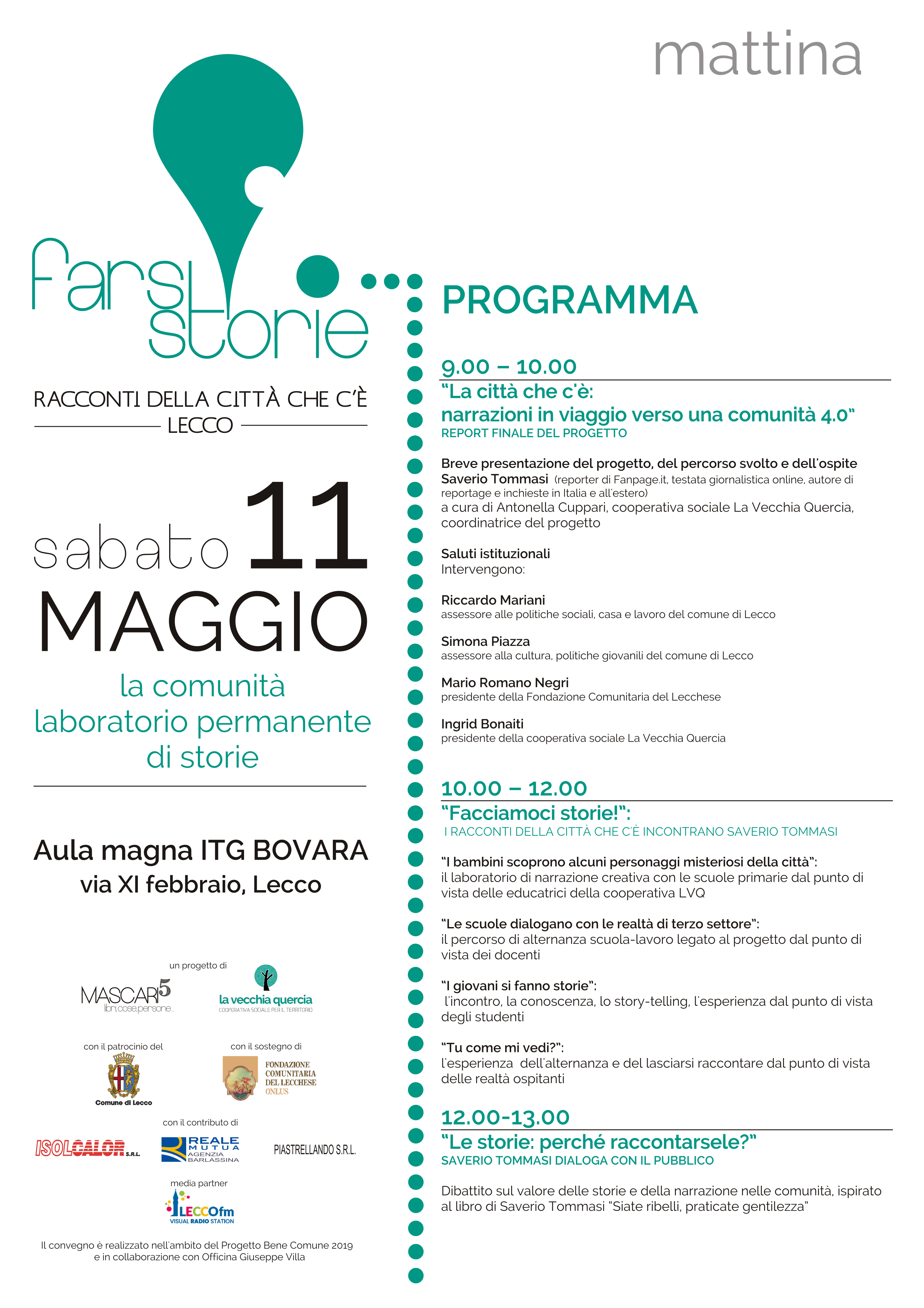 > Si comincia in mattinata presso l’Aula Magna ITG Bovara (via XI Febbraio) con il convegno La comunità, laboratorio permanente di storie, che vedrà la presentazione del progetto a cura della Coordinatrice Antonella Cuppari e in compagnia dell’autore Saverio Tommasi, i cui scritti hanno accompagnato il percorso svolto dagli adolescenti e che dialogherà con il pubblico sul valore delle storie e della narrazione nelle comunità. Il convegno vedrà la partecipazione delle Educatrici della cooperativa, delle Insegnanti delle Scuole e dei rappresentati delle Associazioni coinvolte, che racconteranno il percorso di scoperta e narrazione svolto in compagnia dei giovani. All’evento interverranno inoltre gli Assessori del Comune di Lecco Riccardo Mariani e Simona Piazza, il Presidente della Fondazione Comunitaria Del Lecchese Mario Romano Negri, e la Presidente della Cooperativa Sociale La Vecchia Quercia Ingrid Bonaiti.