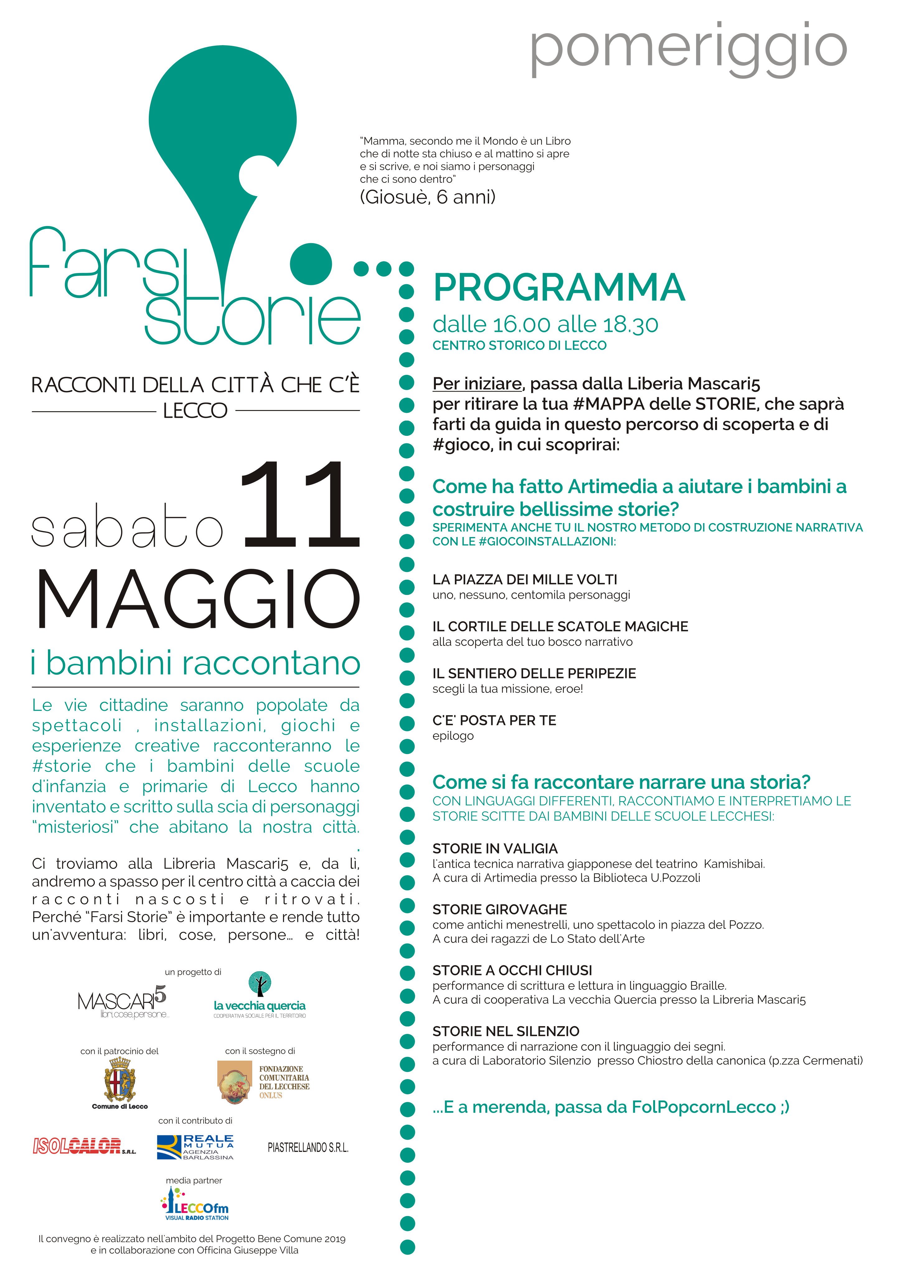 >Dalle 16.30 del pomeriggio, invece, con I bambini raccontano | Storie e spettacoli in città dalla Libreria Mascari5 le vie cittadine saranno popolate da spettacoli, installazioni, giochi e esperienze creative che racconteranno le storie che i bambini delle Scuole d’Infanzia e Primarie di Lecco, insieme agli utenti di Artimedia, la rete di servizi per persone adulte con disabilità, hanno inventato e scritto sulla scia di personaggi “misteriosi” che abitano la nostra città. In questo evento, realizzato in collaborazione con Officina Giuseppe Villa e numerose altre realtà creative cittadine sarà possibile sperimentare in prima persona il metodo di costruzione narrativa utilizzato da Artimedia e, grazie alla MAPPA delle STORIE, scovare nel centro cittadino le GIOCO INSTALLAZIONI e fruire di numerosi SPETTACOLI, che spazieranno dal teatrino giapponese Kamishibai alle performaces in linguaggio Braille e dei segni.