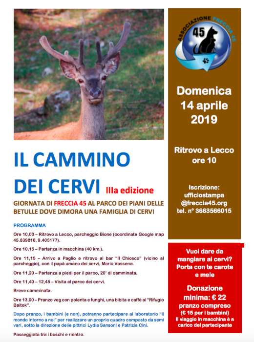 Freccia 45, Associazione no profit nata dieci anni fa a Lecco, organizza una giornata in compagnia della famiglia di cervi che ha salvato. La simpatica giornata è prevista per domenica 12 maggio 2019 al parco dei Pian delle Betulle: passeggiata non impegnativa in un parco, respirare la natura, osservare da vicino una famiglia di cervi e magari poter dar loro da mangiare (sono ghiotti di mele e carote), ed infine coronare il tutto con un pranzo veg di polenta e funghi in una locanda tipica di montagna.