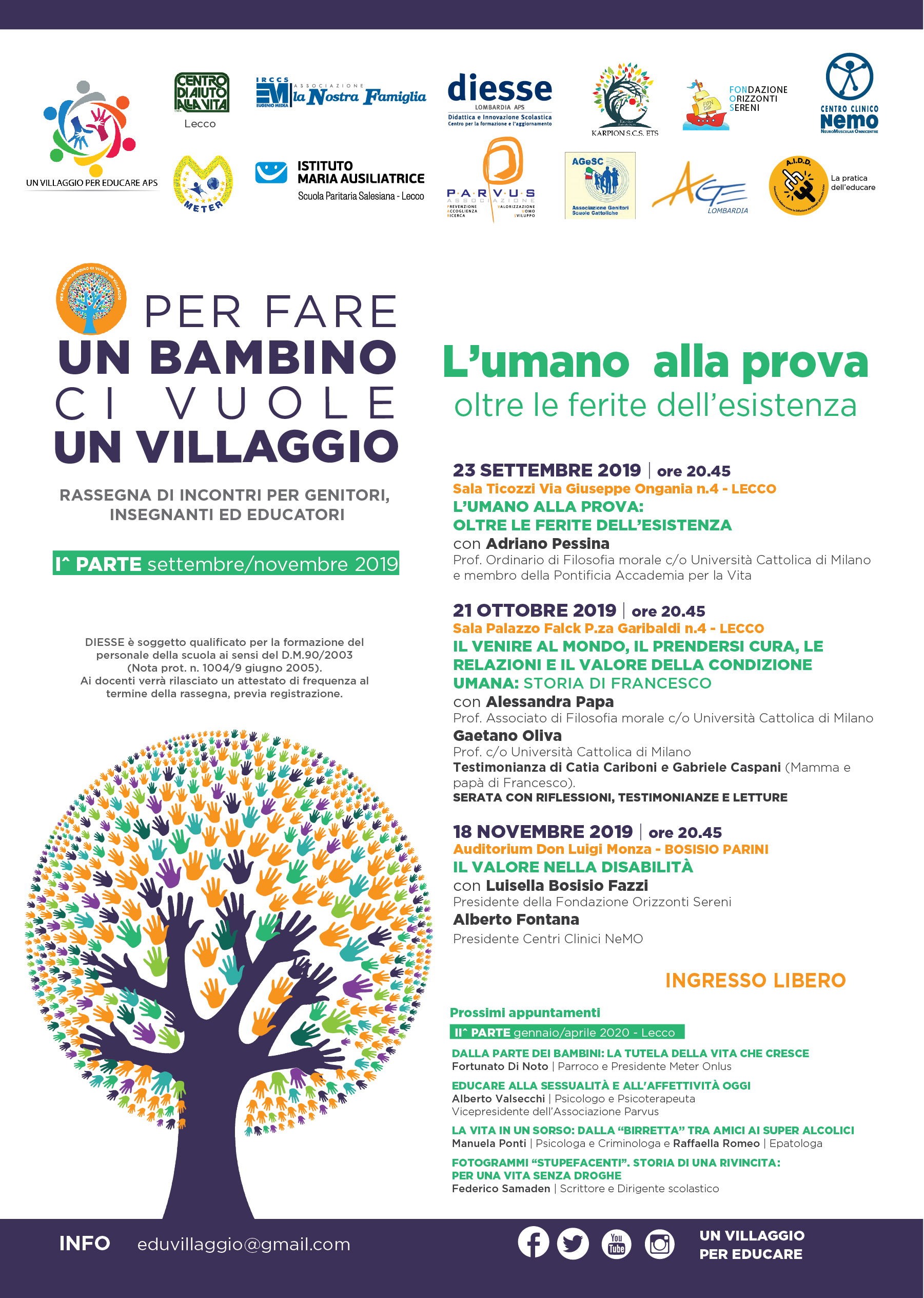 L’incontro è il primo di una serie di sette appuntamenti, rivolti a genitori, docenti, dirigenti ed educatori in genere, proposti e pensati all’interno della rassegna “Per fare un bambino ci vuole un villaggio” organizzata dalla neo-associazione “Un Villaggio per educare APS”, appuntamento ormai giunto alla sua quinta edizione in provincia di Lecco.