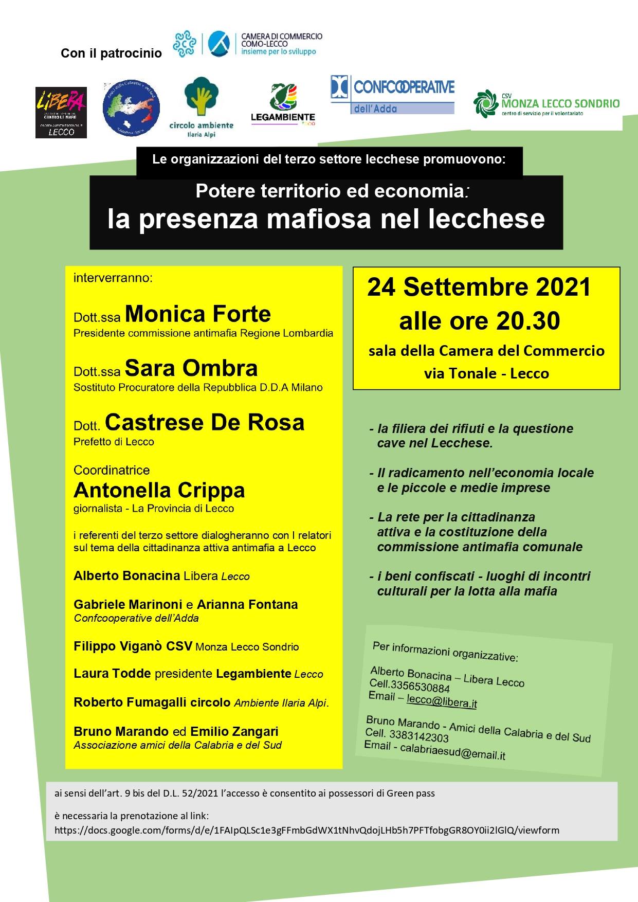 Le organizzazioni del terzo settore lecchese promuovono l’incontro “Potere territorio ed economia: la presenza mafiosa nel lecchese”, venerdì 24 settembre ore 20.30 presso la Sala della Camera di Commercio, via Tonale 28/30 a Lecco.