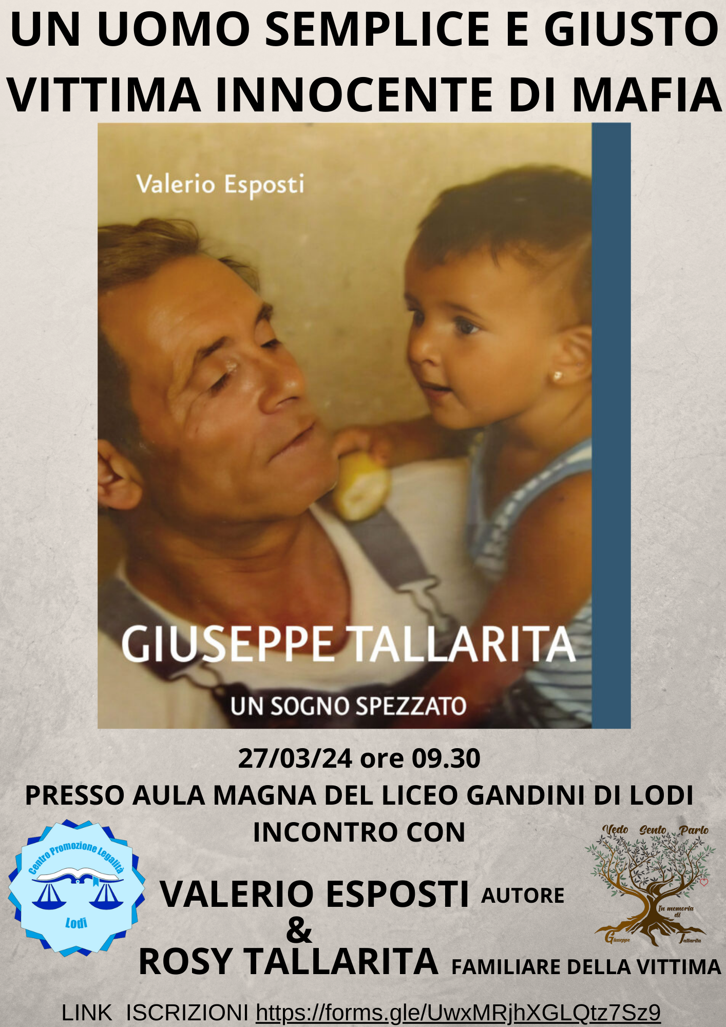 In occasione della attività organizzate intorno alla giornata del 21 di marzo, giorno della memoria e dell’impegno in ricordo delle vittime innocenti delle mafie, il CPL – Centro di Promozione Legalità – di Lodi è lieto di ospitare Valerio Esposti e Rosy Tallarita, il 27 marzo 2024 alle ore 9:30 presso l’Aula Magna del Liceo Gandini di Lodi.