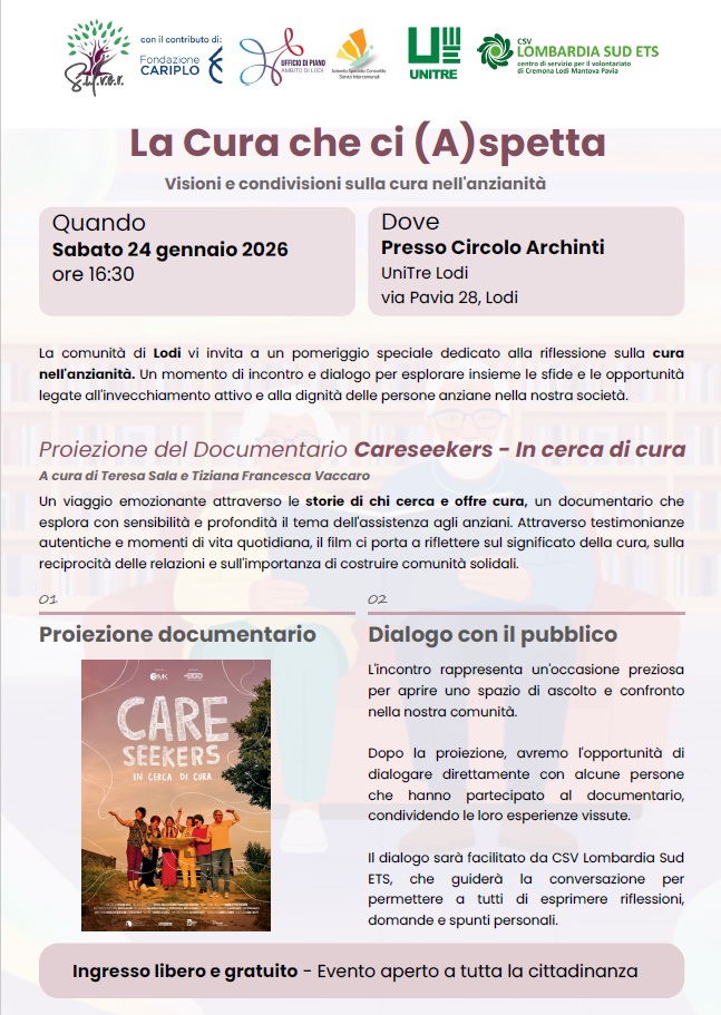 Vedremo insieme alle registe e a dei protagonisti il Docufilm CareSeekers – La cura che ci aspetta e poi ci confronteremo sui temi della cura, del futuro, delle possibilità di cambiamento della cultura della longevità che possiamo pensare, sperimentare, agire nei nostri territori.