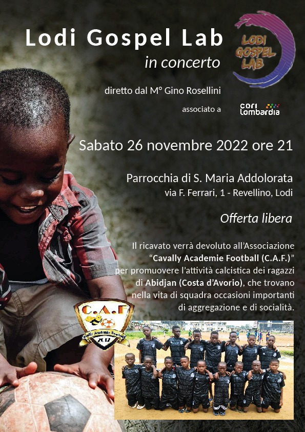 Sabato 26 novembre 2022 alle ore 21.00 Lodi Gospel Lab canterà nella parrocchia di S. Maria Addolorata, in Via F. Ferrari, 1 a Lodi.