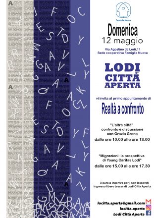 Lodi Città Aperta invita la cittadinanza al primo appuntamento di “Realtà a confronto”, che si svolgerà domenica 12 maggio presso la Cooperativa Sociale Famiglia Nuova in Via Agostino da Lodi, 11 a Lodi,  format che si propone di raccontare più realtà andando a dialogare con enti, associazioni e persone presenti sul nostro territorio.