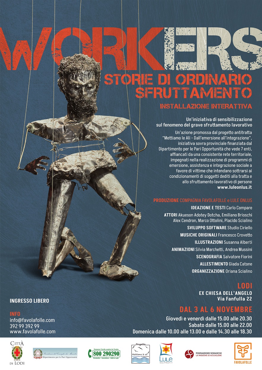 “WORKERS – storie di ordinario sfruttamento” è un’installazione multimediale interattiva dedicata al fenomeno del grave sfruttamento lavorativo realizzata dalla Compagnia Teatrale FavolaFolle e Cooperativa Lule Onlus, che si terrà a Lodi da giovedì 3 novembre a domenica 6 novembre 2022, presso l’Ex Chiesa dell’Angelo in Via Fanfulla 22.