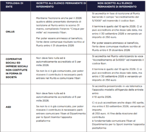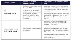 Nella tabella sottostante si riepiloga in forma schematica la situazione relativa all’iscrizione al 5 per mille 2026 delle ex Onlus, delle cooperative sociali e imprese sociali, e delle associazioni sportive dilettantistiche.