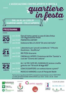 L’Associazione Centro Aperto invita la comunità da venerdì 20 a domenica 22 luglio a “Quartiere in festa”.