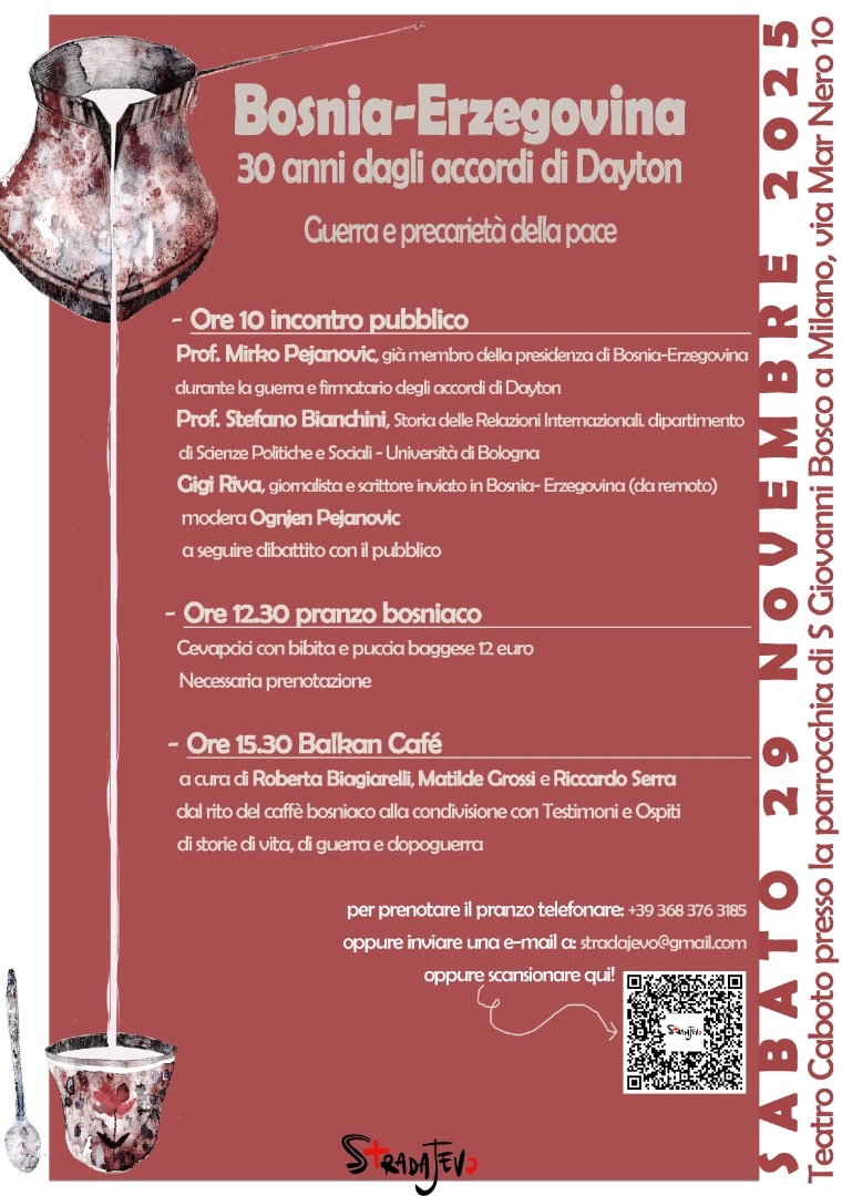 L'associazione Stradajevo organizza per sabato 29 novembre, l'evento "Bosnia-Erzegovina, 30 anni dagli accordi di Dayton. Guerra e precarietà della pace".