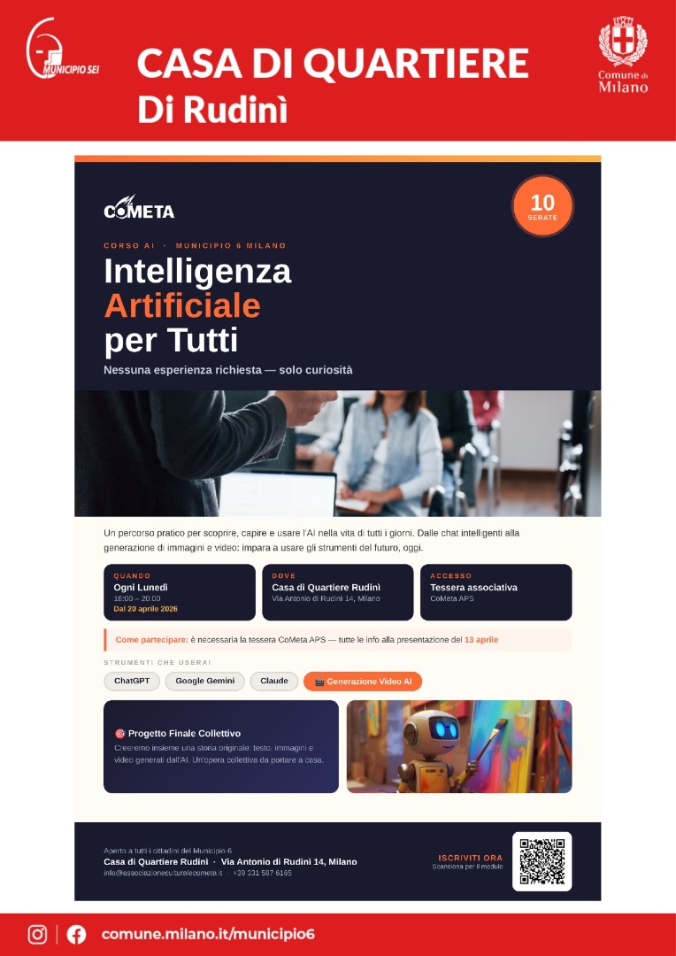 Il corso, organizzato da CoMeta APS, accompagna i partecipanti alla scoperta degli strumenti di intelligenza artificiale generativa (ChatGPT, Google Gemini, Claude) attraverso un approccio pratico e accessibile, senza requisiti tecnici pregressi.
