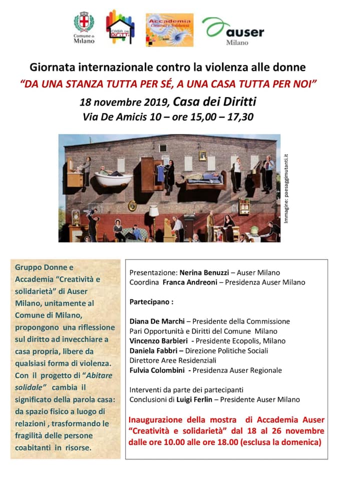 In occasione della Giornata INternazionale contro la violenza sulle donne, il Gruppo donne e Accademia "Creatività e solidarietà" di Auser Milano, in collaborazione con il Comune di Milano, organizzano per lunedì 18 novembre, alle ore 15.30, alla Casa dei Diritti di via De Amicis 10 a Milano, "Da una stanza tutta per sè, a una casa tutta per noi".