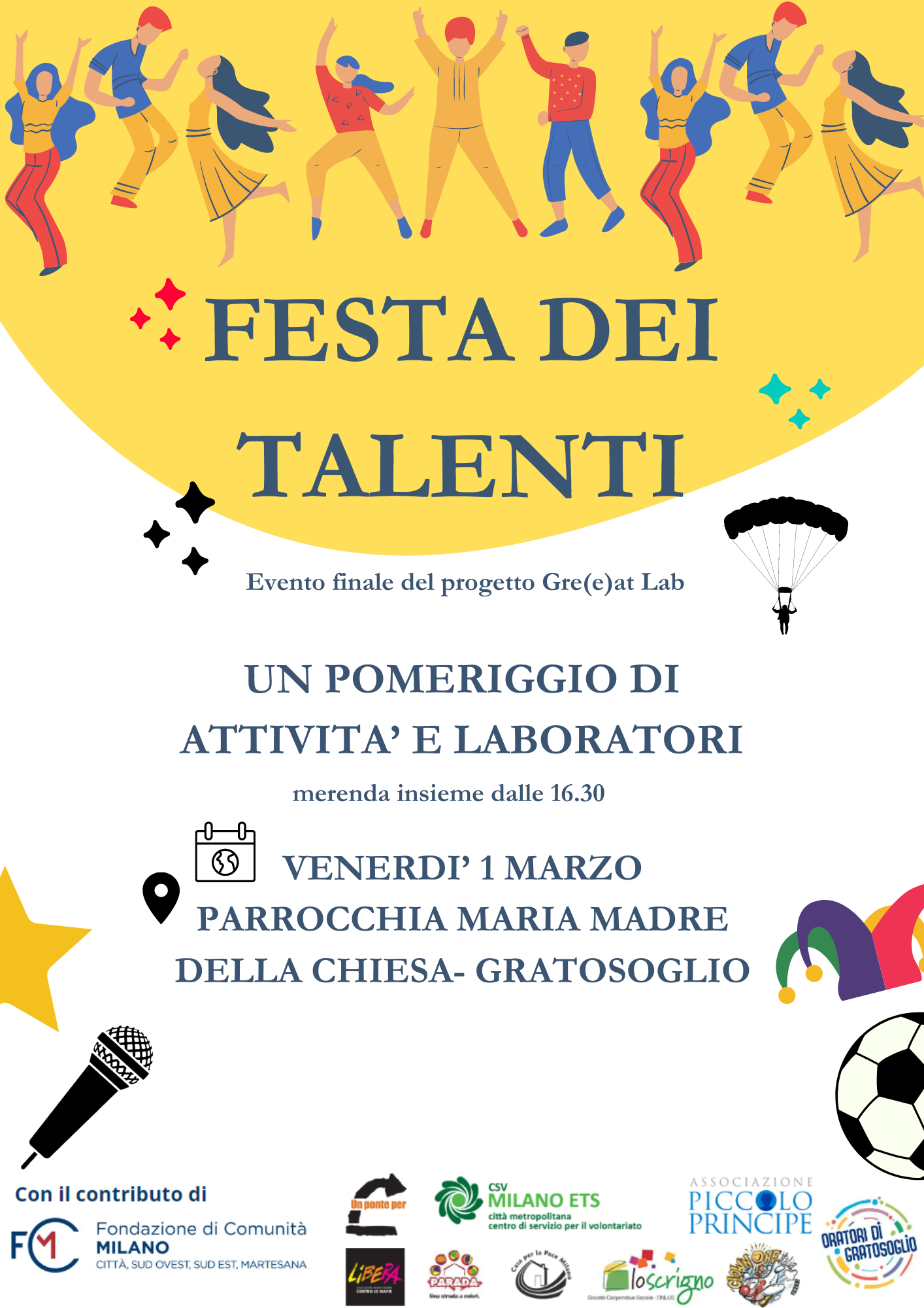 Venerdì 1 marzo, a partire dalle ore 16.30, alla Parrocchia Maria Madre della Chiesa di Gratosoglio a Milano, si svolgerà la “Festa dei talenti”, evento di chiusura del progetto “Gre(e)at Lab,