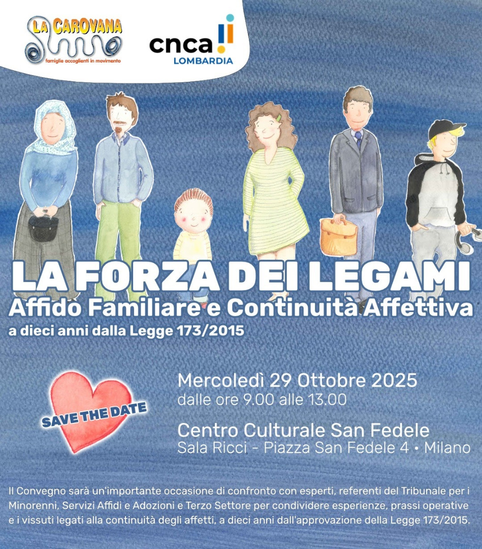 La Carovana e CNCA Lombardia organizzano "La forza dei legami. Affido familiare e continuità affettiva" che si terrà mercoledì 29 ottobre, dalle ore 8.30 alle 13.00, al Centro Culturale San Fedele, Sala Ricci, in piazza San Fedele 4 a Milano.