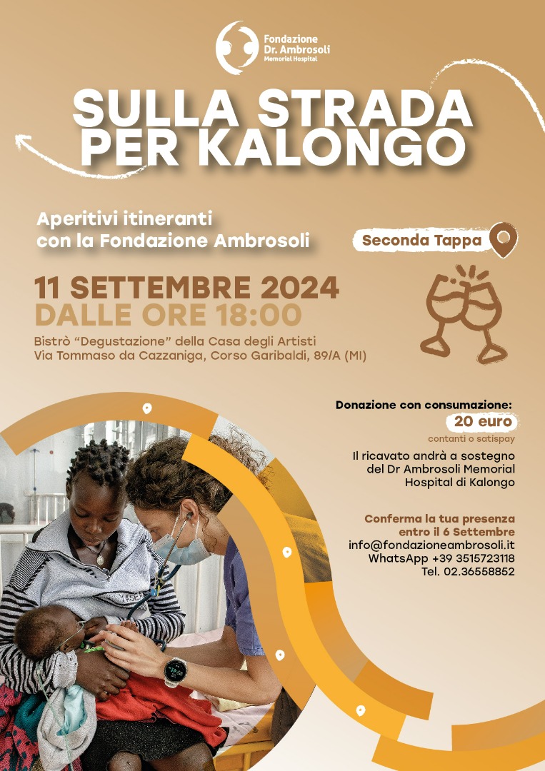 Ti aspettiamo mercoledì 11 settembre 2024, dalle ore 18.00, al Bistrò "Degustazione" della Casa degli Artisti, in via Tommaso da Cazzaniga, corso Garibaldi 89/A, a Milano alla seconda tappa dei nostri aperitivi itineranti per trascorrere una piacevole serata insieme, in un ambiente accogliente, condividendo ciò che ci lega: Kalongo e il suo ospedale.