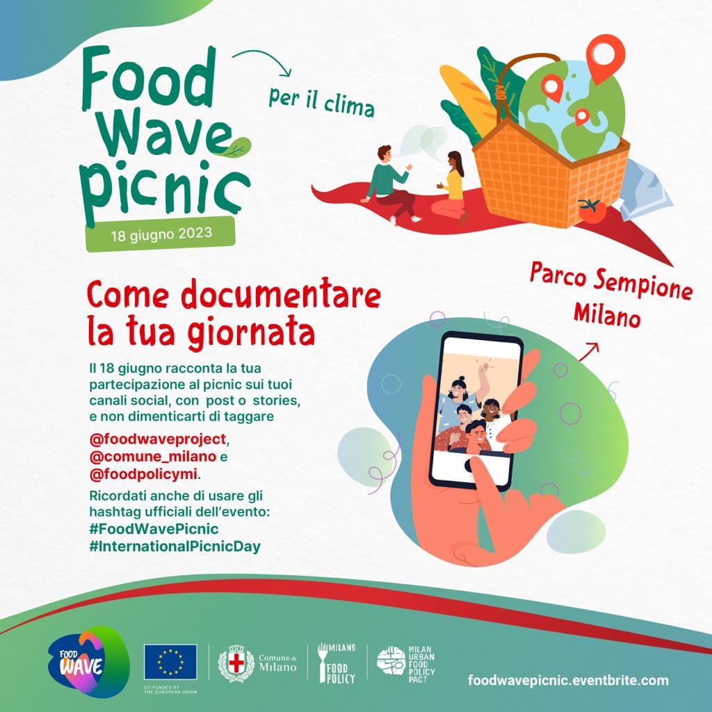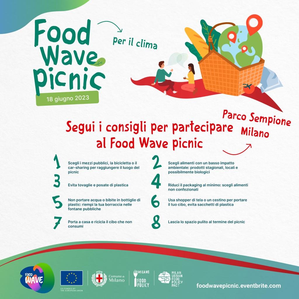 Il Food Wave Picnic – Insieme per il clima! sarà un grande picnic sostenibile internazionale, che si svolgerà al Parco Sempione e, in contemporanea, in diverse città del mondo, senza produrre sprechi e valorizzando le tipicità locali e stagionali. L’evento sarà un’occasione preziosa di incontro e condivisione per la comunità intera e un’opportunità per mettere in pratica concretamente un consumo alimentare più sostenibile e consapevole: il picnic sarà infatti improntato rigorosamente alla sostenibilità e ai principi che puntano alla riduzione degli sprechi alimentari e nello stesso contesto ci saranno dei momenti di riflessione collettiva sull’impatto che la nostra alimentazione ha sul clima e su come è possibile ridurlo. Ogni partecipante porterà il proprio pranzo nel rispetto di preziosi consigli sul consumo alimentare sostenibile, che saranno condivisi con tutte e tutti, e avrà la possibilità di prendere parte a performance musicali o assistere a talk dedicati al nesso cibo-clima. Volontarie e volontari avranno un ruolo centrale nello svolgimento del picnic, nell’ottica di un momento di partecipazione collettiva per la promozione di un bene comune quale è l’ambiente: accoglieranno le persone che parteciperanno all’evento, ricorderanno i consigli contenuti nel vademecum che sarà loro fornito al momento dell’iscrizione per un pranzo a basso impatto ambientale, distribuiranno frutta e verdura gratuite, daranno supporto allo svolgimento dei diversi momenti dell’evento e si assicureranno che al termine del picnic il parco sia pulito. La realizzazione dell’iniziativa è possibile grazie al progetto Food Wave del Comune di Milano, supportato dalla Commissione Europea e sviluppato con un partenariato di 29 città e ONG europee e brasiliane. Al centro del progetto vi è la creazione di un sistema alimentare più sostenibile, a partire dall’azione delle giovani generazioni: tutte e tutti possiamo fare la nostra parte, perché la sostenibilità è un valore che si può applicare tutti i giorni.