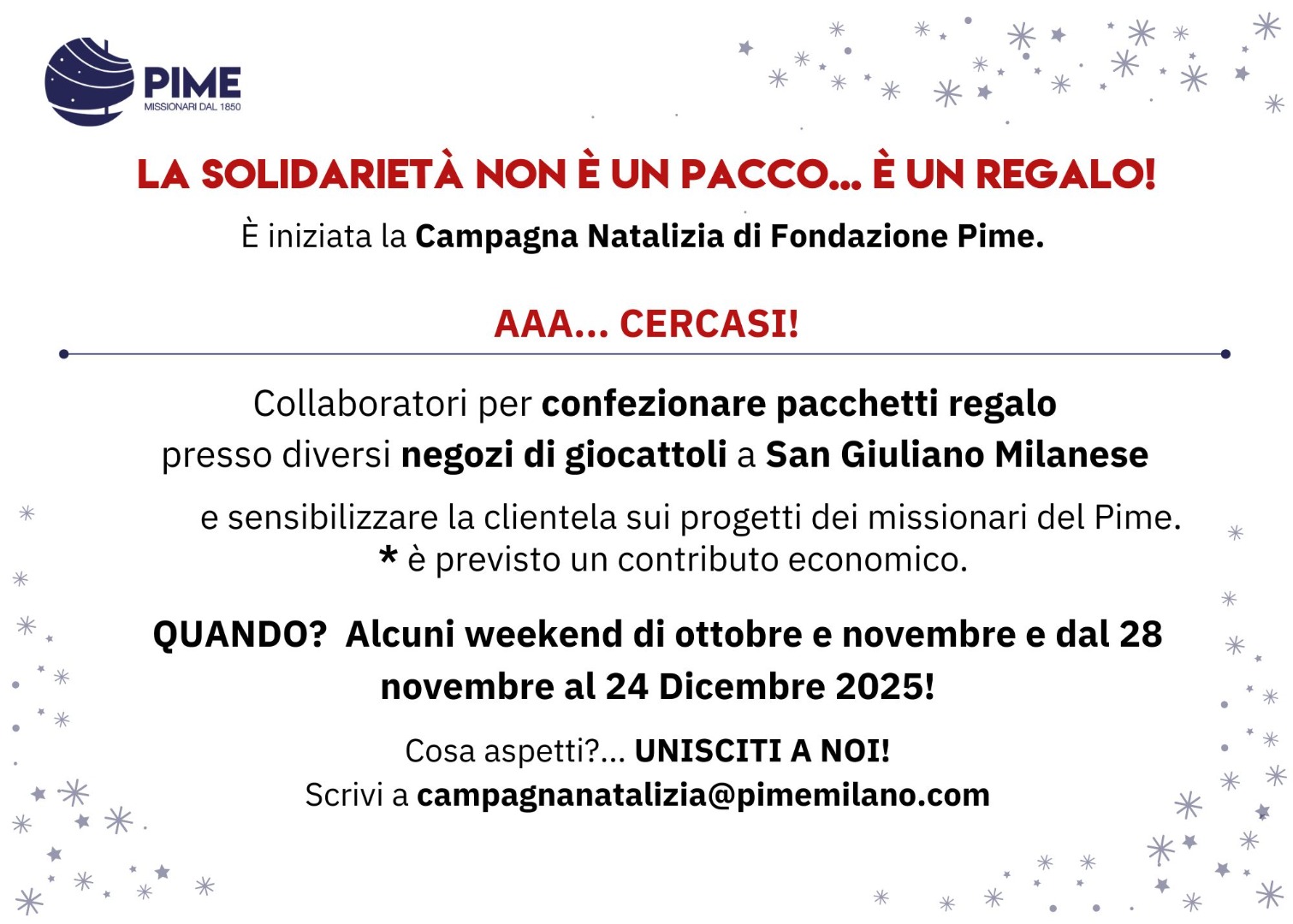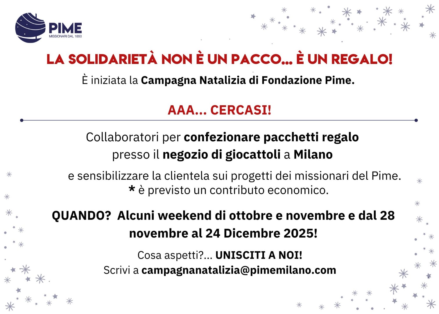 Fondazione Pime Onlus di Milano, realtà legata ai missionari del Pime ricerca volontari per il confezionamento di regali all'interno dei negozi di giocattoli per bambini.