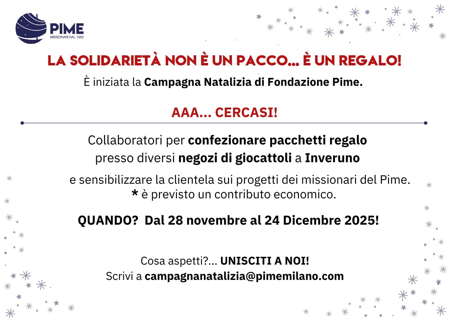 In cambio del pacchetto, viene chiesta una donazione libera che aiuta a sostenere i progetti dei Missionari del Pime in Italia e nel Mondo. Ai volontari viene chiesto anche di promuovere la realtà con i clienti e consegnare il volantino informativo dedicato alla campagna natalizia.