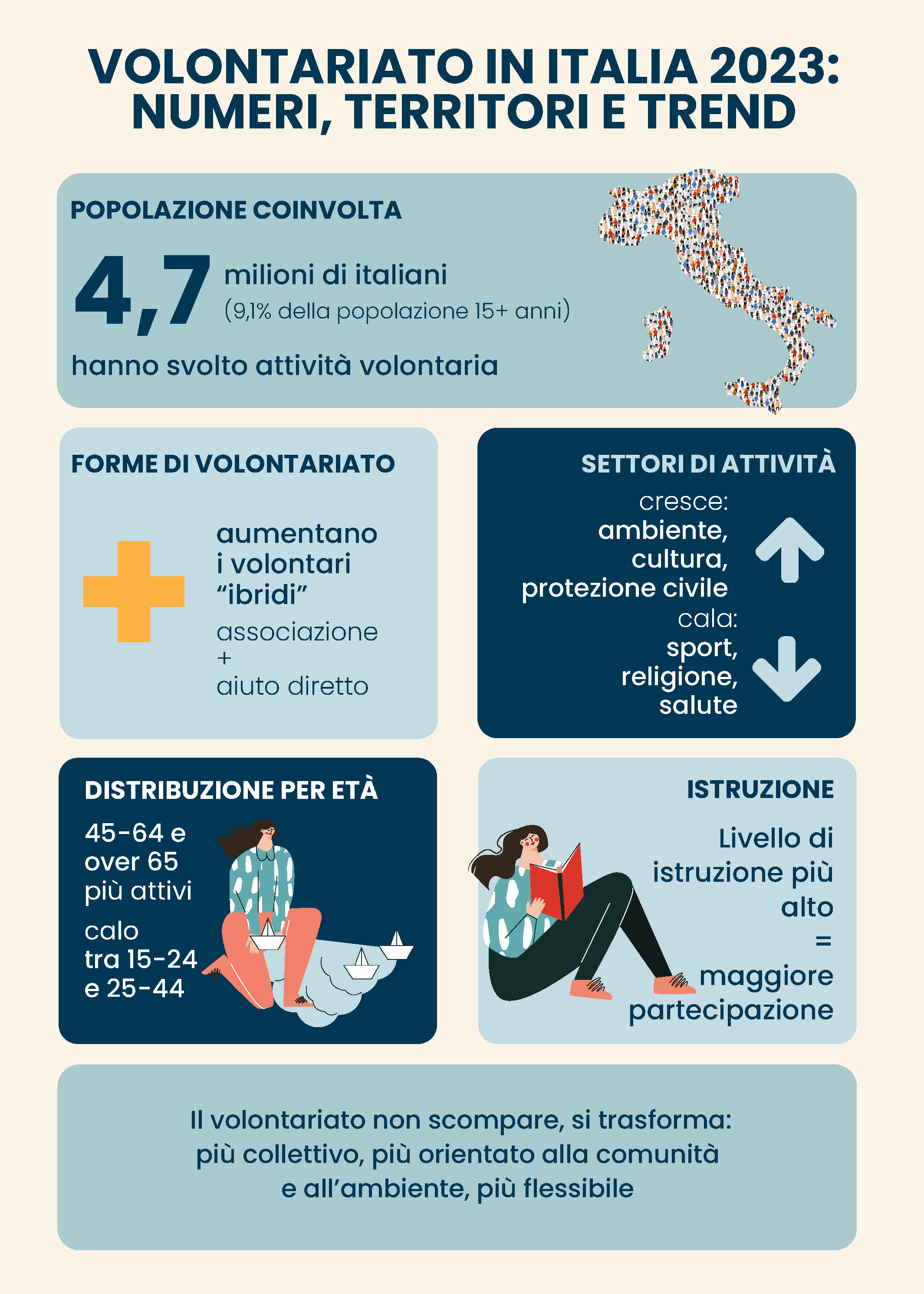 Secondo l’ISTAT, il volontariato in Italia nel 2023 mostra un profilo nuovo: meno diffuso, ma più orientato a comunità, ambiente e protezione sociale, con forme di impegno più fluide e partecipazione ibrida tra aiuto diretto e associazionismo.