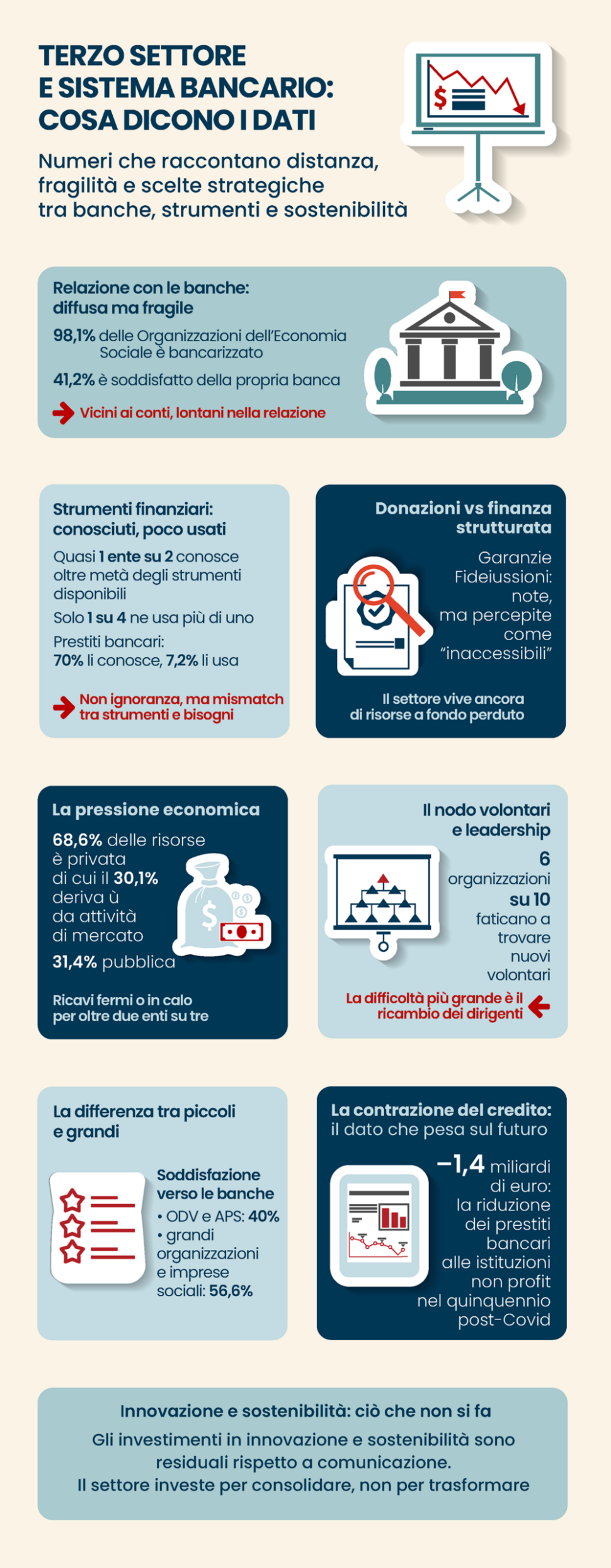 I motivi? Garanzie percepite come irraggiungibili, prodotti poco calibrati, relazioni frammentate. Non stupisce che molte realtà preferiscano affidarsi all’autofinanziamento o alle fondazioni bancarie.