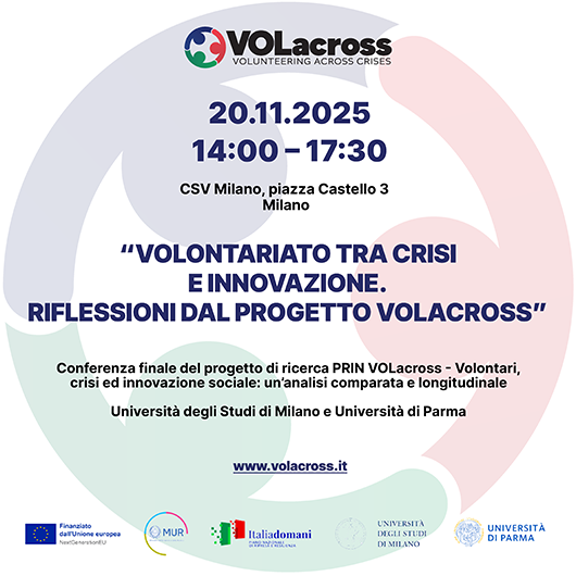 “Volontariato tra crisi e innovazione. Riflessioni dal progetto VoLacross” è il titolo della conferenza finale del ciclo di seminari “Il volontariato: tra impegno ed innovazione” organizzati nell’ambito del progetto di ricerca PRIN “VOLacross – Volontari, crisi ed innovazione sociale: un’analisi comparata e longitudinale” a cura dell’Università degli Studi di Milano e dell’Università di Parma. Il progetto si propone di creare occasioni di riflessione e dialogo sul ruolo del volontariato durante (e oltre) i momenti di crisi, nel generare, favorire e accompagnare processi di profonda trasformazione sul piano sociale, culturale e politico.