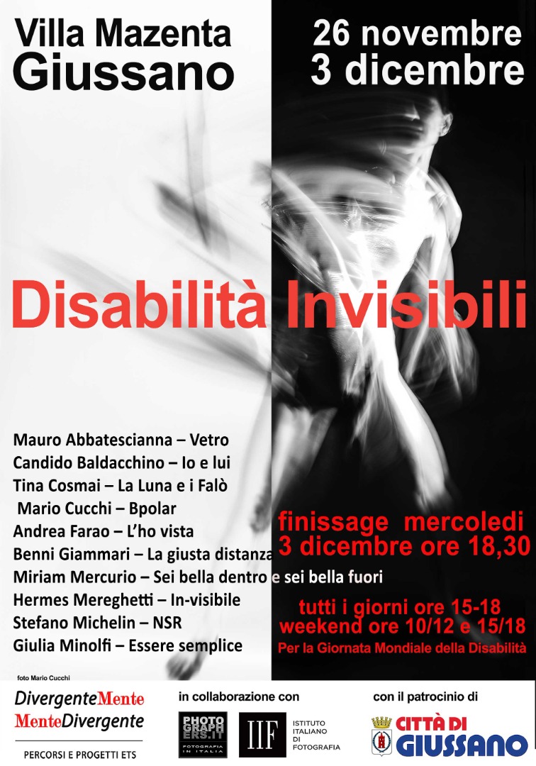 Dopo il successo dell’ultima esposizione, torna a Villa Mazenta un nuovo progetto espositivo di DivergenteMente ETS – Percorsi & Progetti, dedicato a un tema di grande attualità e sensibilità sociale: “Disabilità Invisibili”, visitabile dal 26 novembre al 3 dicembre 2025. La mostra si inserisce nel percorso culturale promosso dall’Associazione in collaborazione con Photographers.it e l’Istituto Italiano di Fotografia (IIF), con il patrocinio del Comune di Giussano.