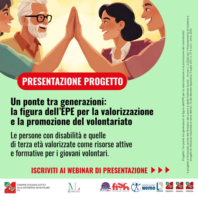UILDM con il progetto "Un ponte tra generazioni: la figura dell’EPE per la valorizzazione e la promozione del volontariato" intende dare i giusti strumenti a chi opera nel volontariato da sempre, ma fatica a trovare e coinvolgere giovani per passare il testimone.