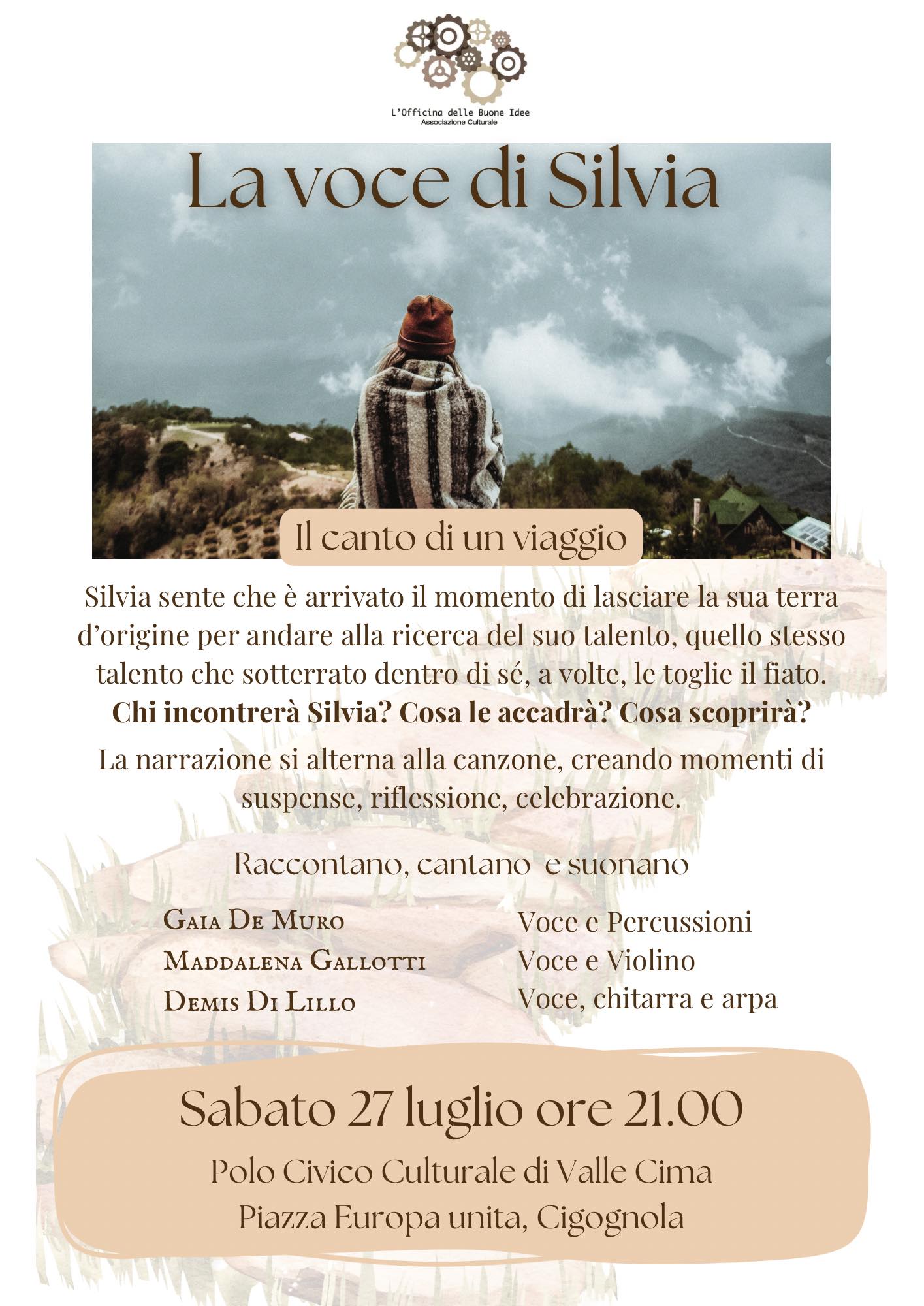L’Associazione culturale L’Officina delle Buone Idee propone La voce di Silvia, storia di tutti quelli che non si accontentano, di quelli che cercano, di quelli che hanno il coraggio di lasciare tutto per ritrovarsi.