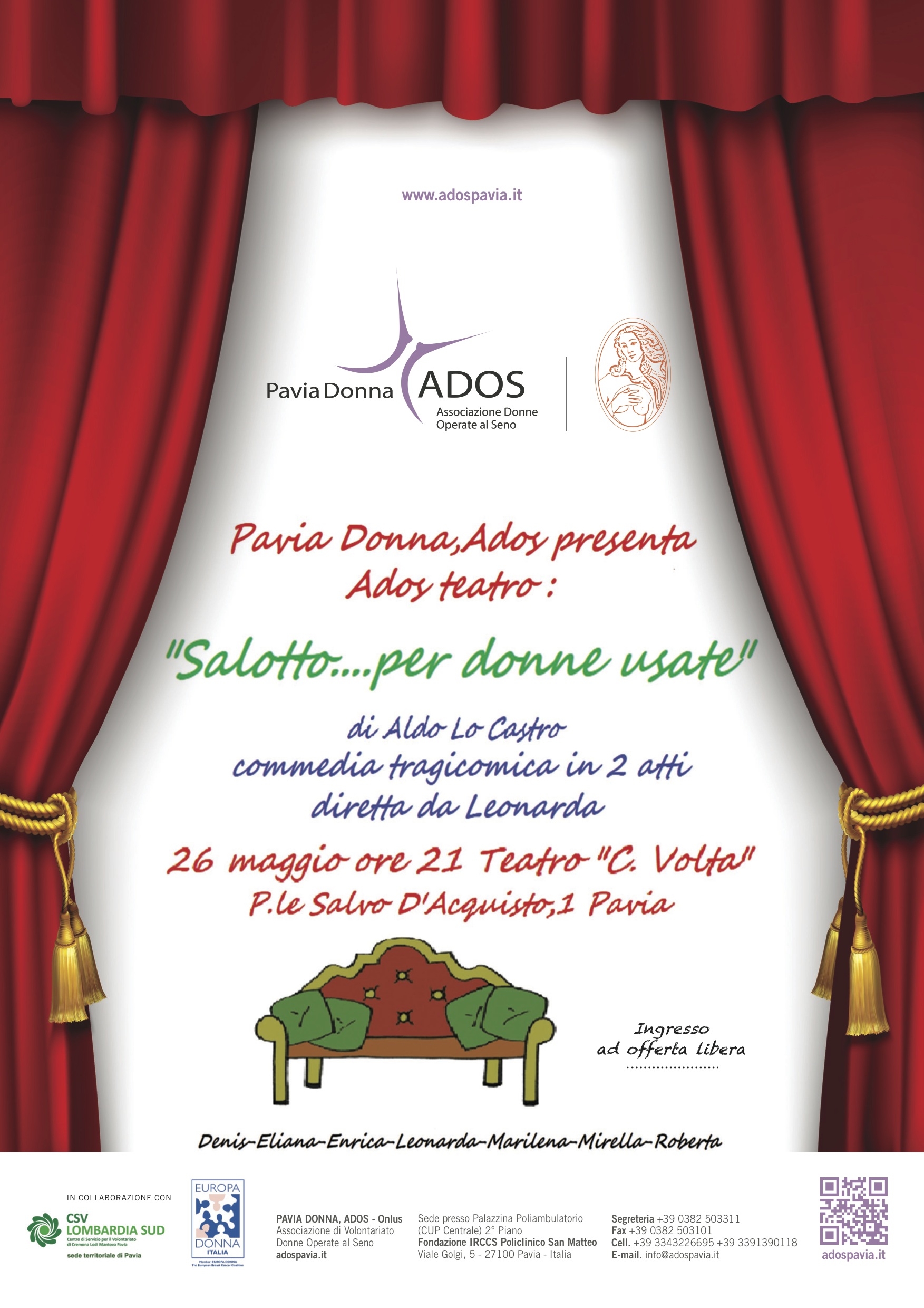 Sabato 26 maggio ore 21.00 presso il Teatro Volta si esibiranno le amiche del Gruppo Ados Teatro che metteranno in scena la commedia tragicomica” Salotto per donne usate” dopo un anno di preparazione, fatto di risate e sofferenze, dirette da Leonarda.