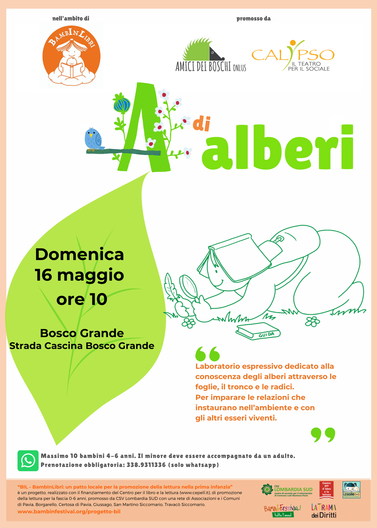 L’associazione Amici dei Boschi, insieme all’Associazione Calypso, propone A di Alberi , laboratorio di conoscenza degli alberi per i più piccoli. Un laboratorio espressivo dedicato alla conoscenza degli alberi attraverso le foglie, il tronco e le radici, per imparare le relazioni che si instaurano nell’ambiente e con gli altri esseri viventi. Un’esperienza di esplorazione e di scoperta della biodiversità condotti da una naturalista e un animatore. Ogni laboratorio è dedicato ad un massimo di 10 bambini fra i 4-6 anni, prenotazione obbligatoria allo 338.9311336 (via whatsapp).