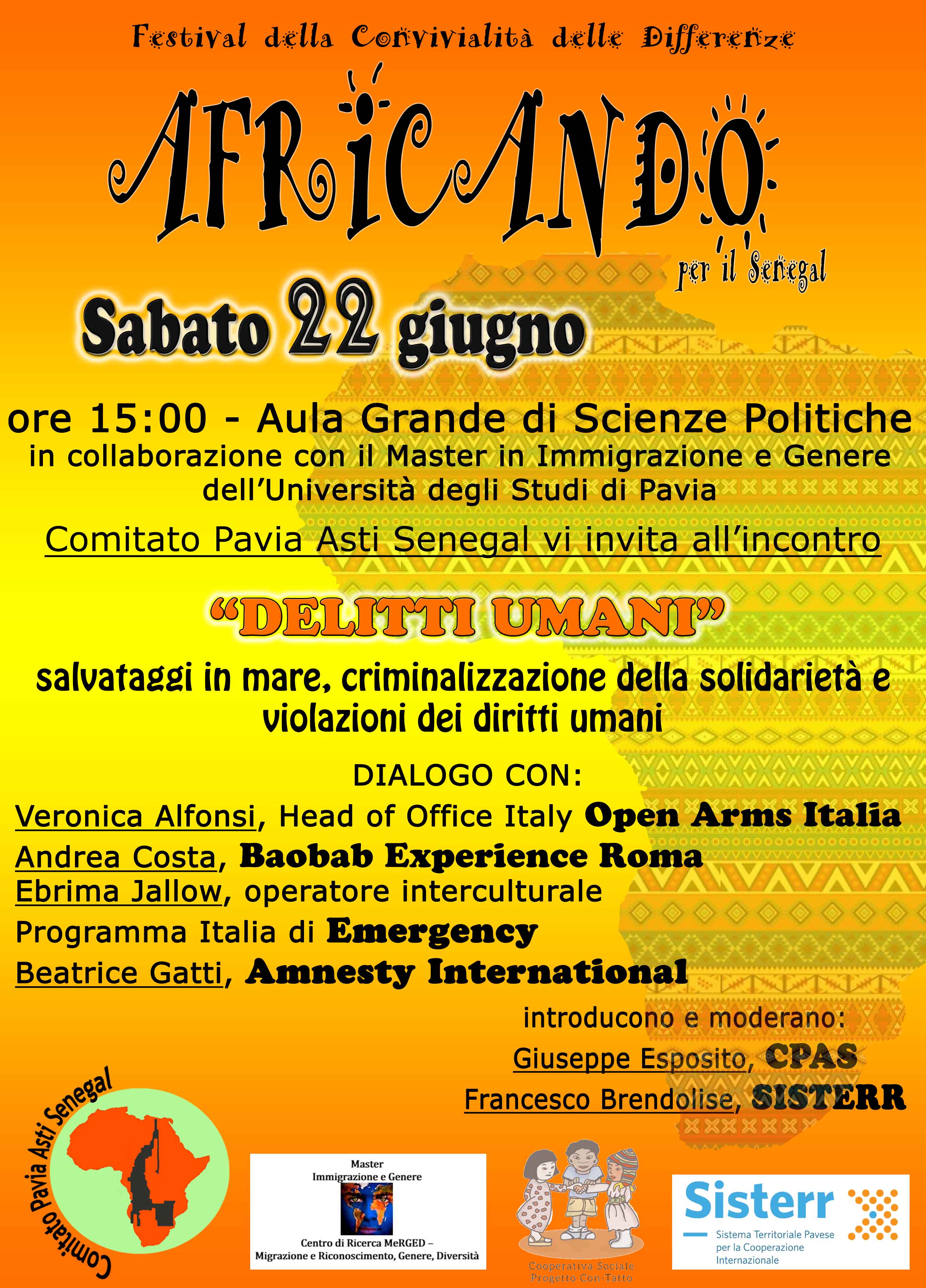 Quest’anno Africando ospiterà sabato 22 alle 15.00, in collaborazione con il Master in Immigrazione e Genere dell’Università degli Studi di Pavia e la Coop. Soc. Progetto Con-tatto, la conferenza “Delitti Umani: salvataggi in mare, criminalizzazione della solidarietà e violazione dei diritti umani” presso l’Aula Grande di Scienze Politiche.