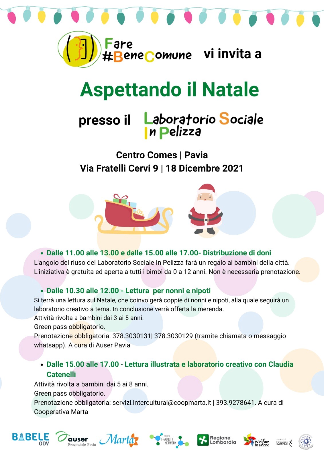 Sabato 18 dicembre presso Centro Comes in via Fratelli Cervi 9 a Pavia si terrà una giornata piena di iniziative rivolte ai bambini, ai genitori e ai nonni, gratuite e aperte a tutti: attività e letture dedicate al Natale e distribuzione di doni per i bambini dai 0 ai 12 anni.