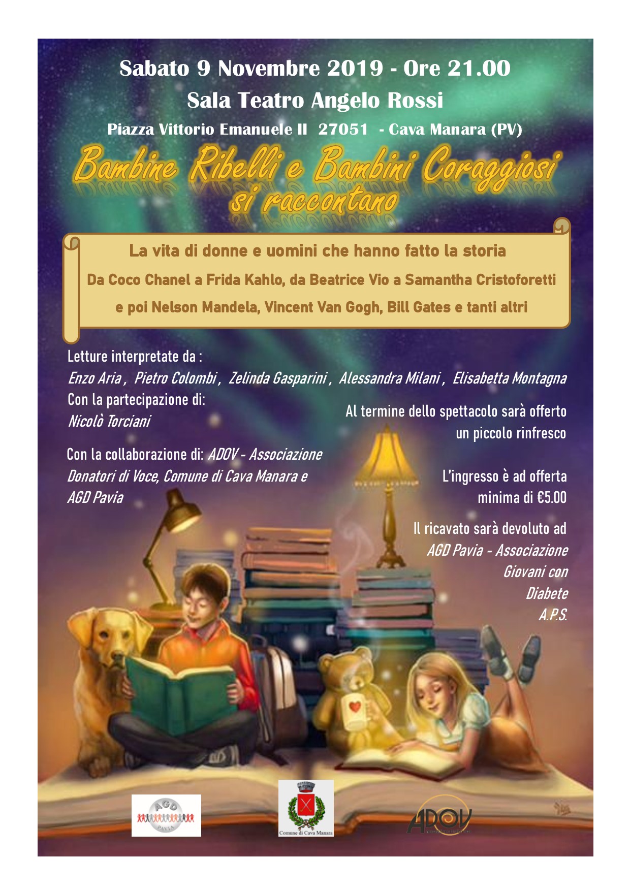Il Comune di Cava Manara in collaborazione con AGD – Associazione Giovani con Diabete – APS e con la partecipazione dei volontari ADOV (Associazione Donatori di Voce) presenta Bambine ribelli e bambini coraggiosi si raccontano.