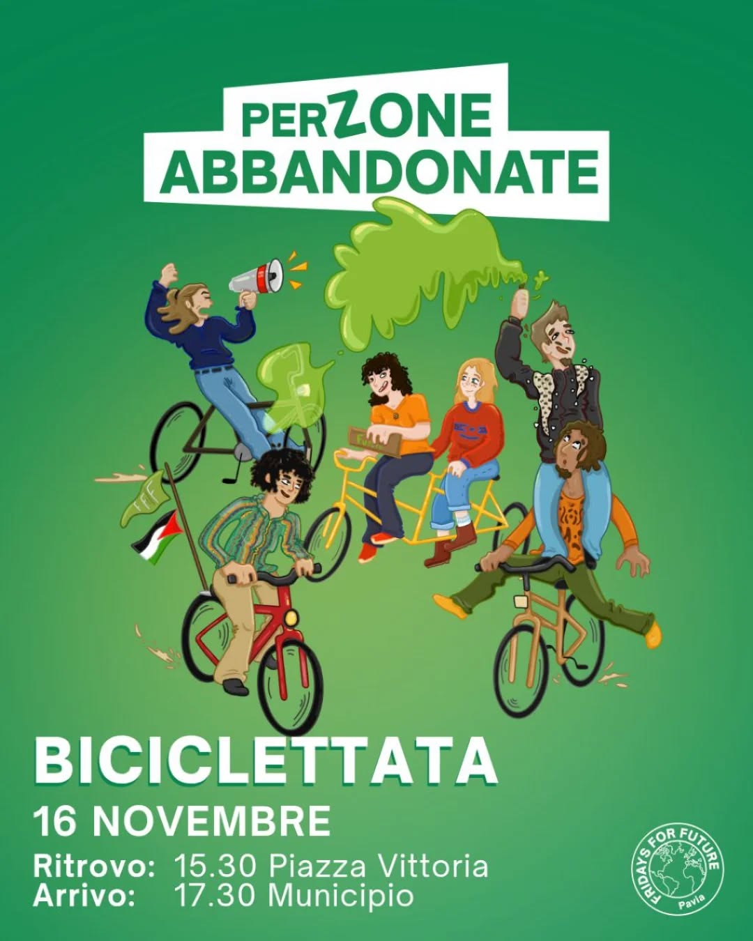 Il movimento Fridays for Future Pavia organizza per domenica 16 novembre una biciclettata cittadina con partenza da Piazza della Vittoria alle 15:30 e arrivo previsto al Municipio alle 17:30.