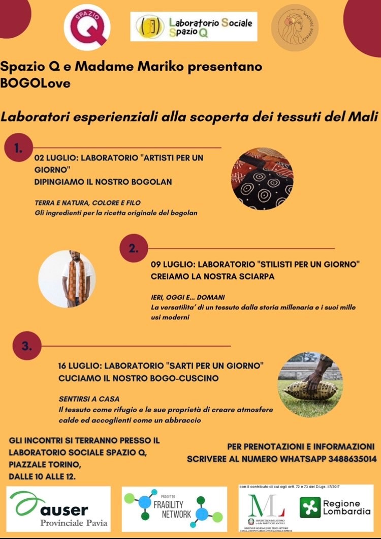 Laboratorio sociale SPAZIO Q in collaborazione con madame Marikó presenta BOGOLove- laboratori esperienziali alla scoperta dei tessuti tipici del Mali, i Bologan, letteralmente tessuti “fatto di fango”.