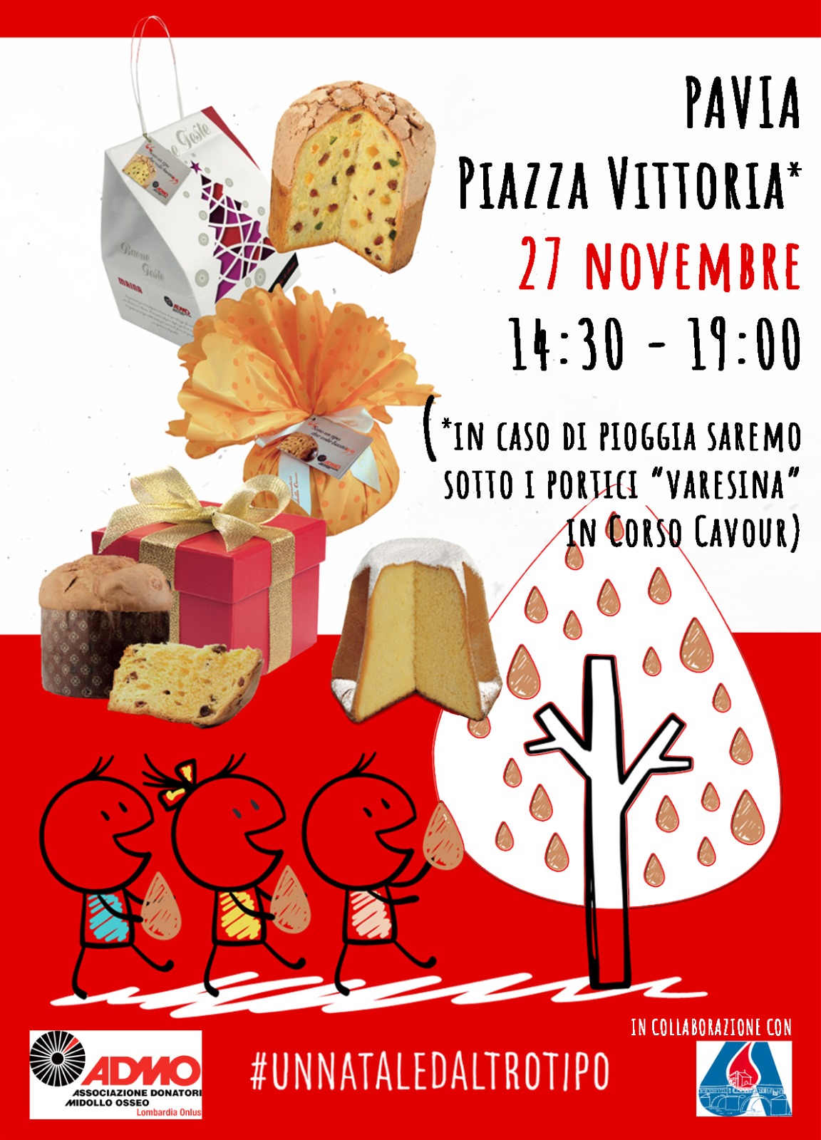 Sabato 27 novembre, dalle 14:30 alle 19:00, i volontari di Avis e di ADMO Pavia si troveranno in piazza della Vittoria (Pavia) per sensibilizzare la cittadinanza sull’importanza della donazione di sangue e midollo osseo e raccogliere eventuali iscrizioni alle due associazioni. Sarà inoltre possibile acquistare dei regali solidali (panettoni, pandori, e altri dolciumi natalizi) attraverso cui sostenere le attività delle associazioni.