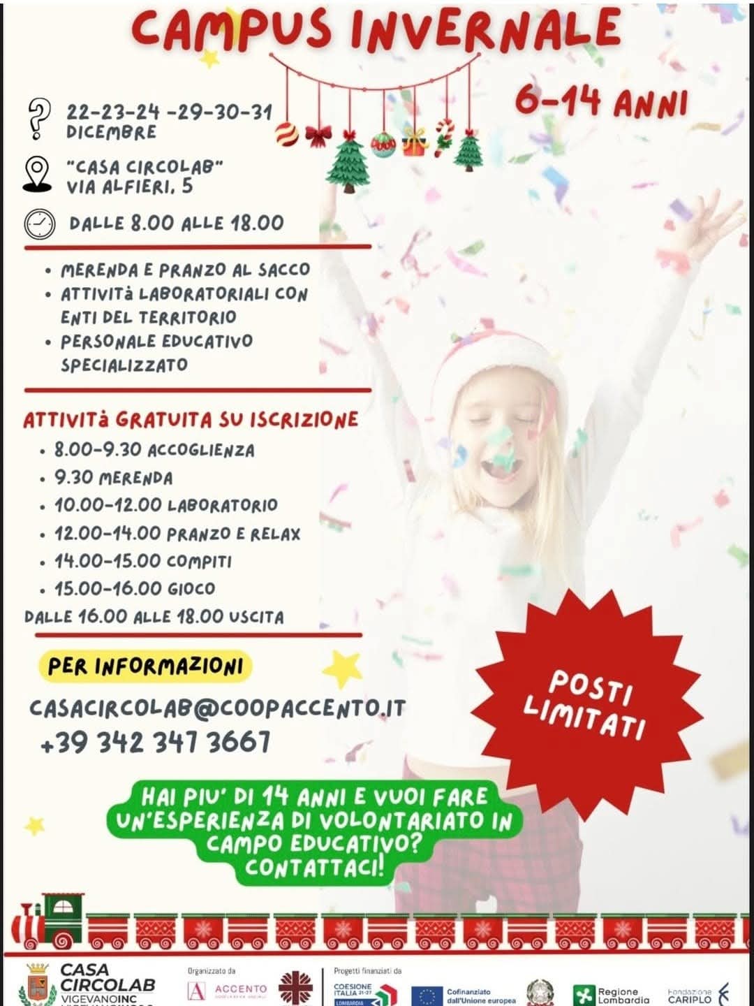 Casa Circolab organizza il Campus Invernale rivolto a bambini e ragazzi tra i 6 e i 14 anni. Le attività si svolgeranno nelle giornate del 22, 23, 24, 29, 30 e 31 dicembre presso la sede di Casa Circolab in via Alfieri 5, con orario dalle ore 8 alle ore 18.