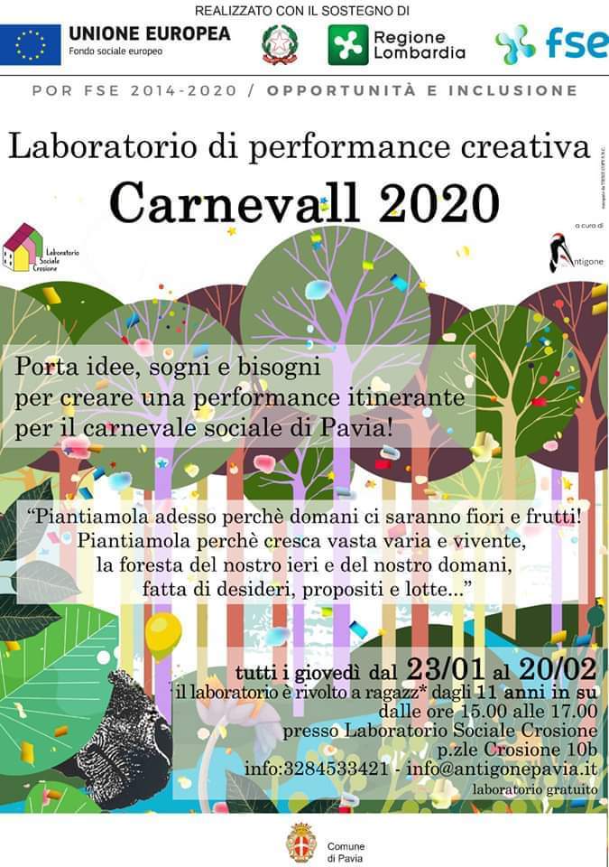 Antigone APS propone un nuovo progetto laboratoriale per creare una performance creativa da realizzarsi in occasione della parata. Tutti i giovedì fino al 22 febbraio, dalle 15 presso il Laboratorio Sociale Crosione verrà ideata e realizzata una parata creativa per l’appuntamento con il CarnevAll. Ragazze e ragazzi dagli 11 anni sono invitati a partecipare e scoprire di cosa si tratta da giovedì 23 gennaio, per tutti i giovedi dalle 15 alle 17, fino al 20 febbraio verrà svolto questo laboratorio gratuito creativo. Per informazioni: info@antigonepavia.it. Il manifesto Il manifesto (199 download )