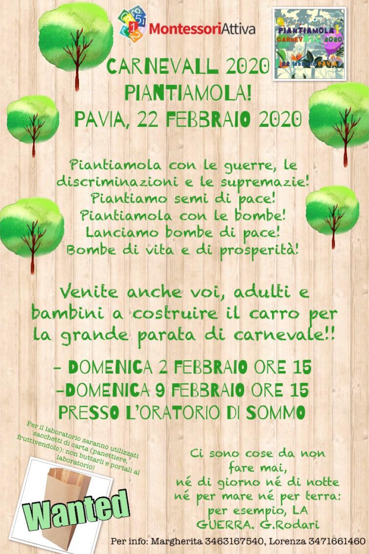 MontessoriAttiva Pavia parteciperà alla parata festiva con un carro rappresentativo che verrà preparato e allestito da chiunque, genitori e bambini, voglia collaborare. I laboratori di preparazione si svolgeranno domenica 2 e 9 febbraio alle ore 15 presso l’Oratorio di Sommo (i genitori sono invitati a rimanere e partecipare). La partecipazione è gratuita. Per info chiamate Margherita tel.3463167540 o Lorenza tel. 3471661460. Il manifesto (203 download )