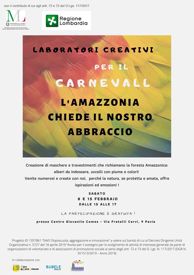 Officina delle Arti Pavia tiene due laboratori creativi. Durante le attività verranno realizzati travestimenti e maschere che richiamano la foresta amazzonica da poter indossare durante la parata del 22 febbraio. Il sabato 8 e 15 febbraio, dalle 15 alle 17 presso il centro Comes, via Fratelli Cervi 9. Le attività sono gratuite e aperte a tutti. Il manifesto (251 download )