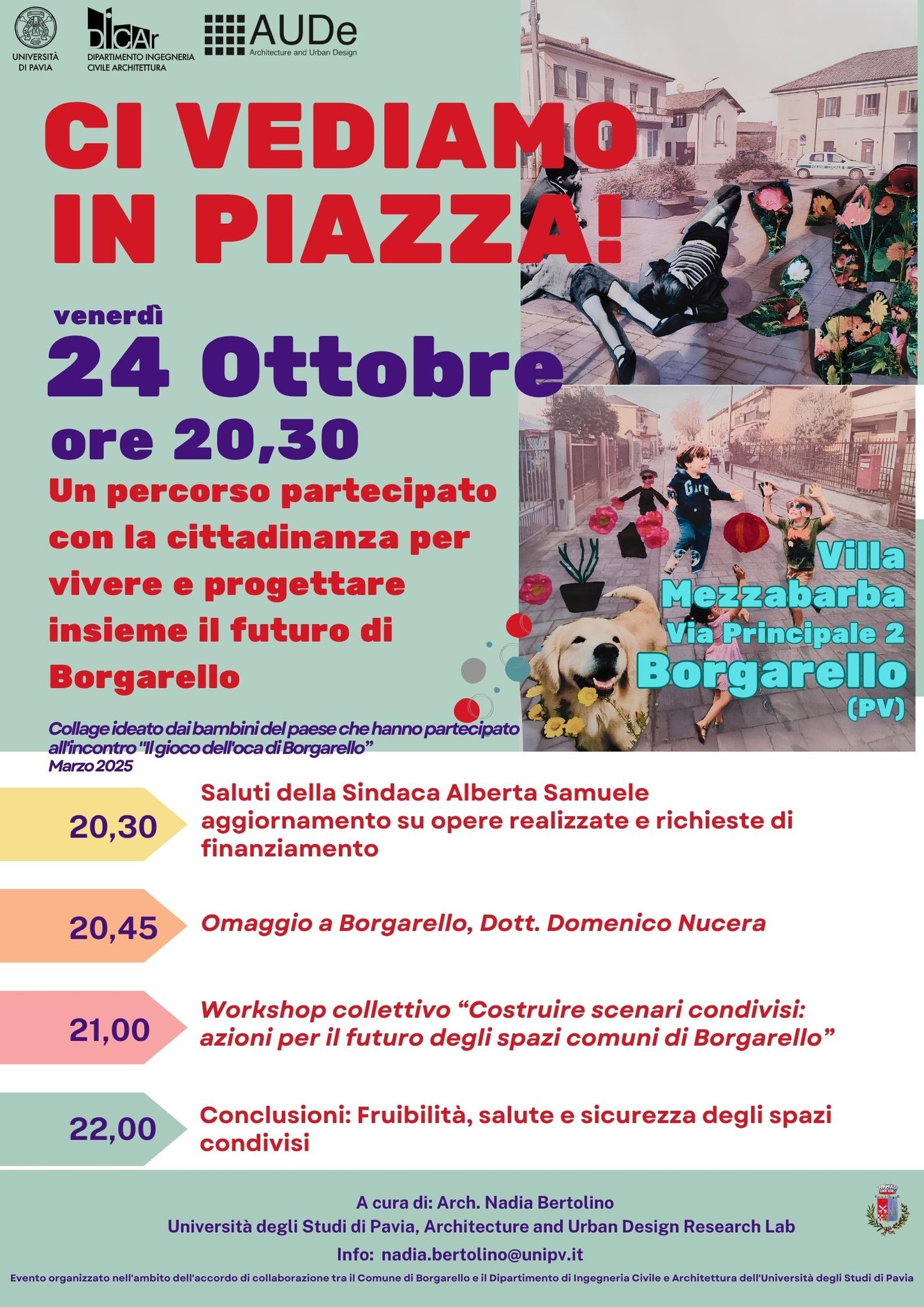 Venerdì 24 ottobre alle ore 20:30, la Villa Mezzabarba di Borgarello (PV) si trasformerà in un luogo di dialogo, idee e partecipazione grazie all’iniziativa “Ci vediamo in piazza!”, un evento aperto a tutti i cittadini per riflettere e progettare insieme il futuro degli spazi comuni del paese.