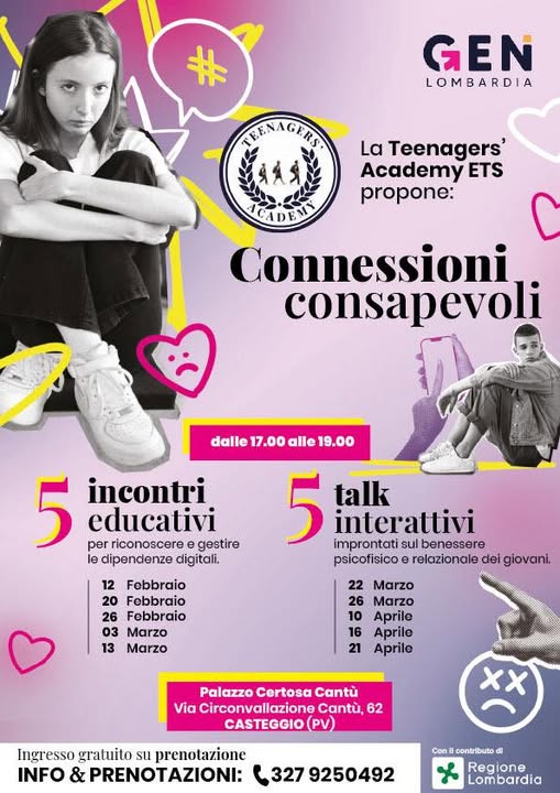 Il percorso, organizzato da Teenagers’ Academy ETS in collaborazione con il Comune di Casteggio, è rivolto a ragazze e ragazzi tra i 15 e i 25 anni e nasce con l’obiettivo di affrontare in modo concreto e partecipato il tema delle dipendenze digitali, sempre più centrale nella vita quotidiana delle nuove generazioni. Smartphone, social network e videogiochi diventano il punto di partenza per una riflessione più ampia sul benessere psicologico, emotivo e relazionale.