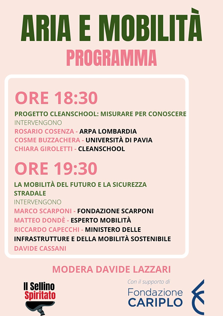L’incontro è volto alla promozione del progetto “Cleanschool”, per cui viene monitorata la qualità dell’aria sui tratti casa-scuola percorsi dagli studenti di Pavia. Il progetto è ideato e condotto da Il Sellino Spiritato in collaborazione con la Scuola Internazionale di Pavia e il Liceo Cairoli di Pavia. Il progetto ha ricevuto il supporto della Fondazione Cariplo mediante il bando Myfuture 2021.