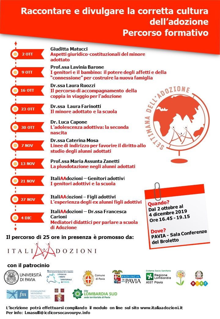 A Pavia un’iniziativa formativa gratuita, ricca ed inedita che riunisce docenti e professionisti che, a vario titolo, si occupano di Adozione. Un’occasione d’incontro, apprendimento e confronto imperdibile. Tutti mercoledì dal 2 ottobre al 4 dicembre, dalle ore 16.45 alle ore 19.15 presso la Sala Conferenze del Broletto.