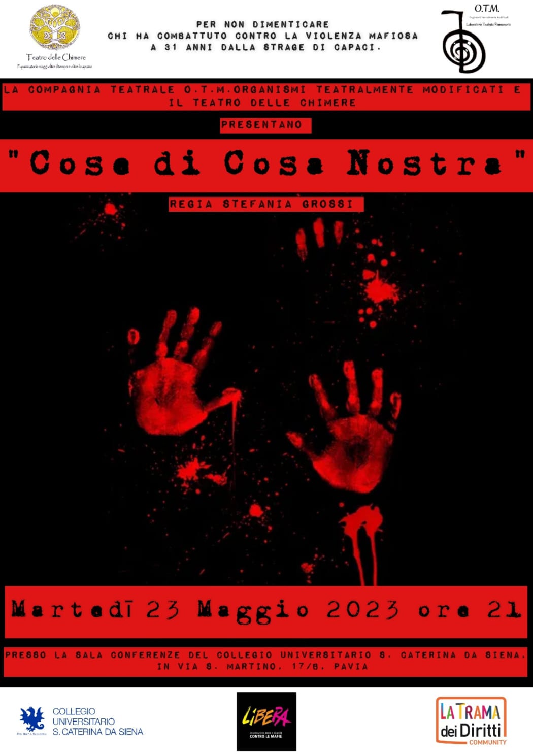 Il Presidio di Libera Pavia e il Collegio Santa Caterina da Siena promuovono una serata di sensibilizzazione sulle mafie con lo spettacolo teatrale “Cose di Cosa Nostra” che si svolgerà martedì 23 maggio alle ore 21.00 presso il Collegio Santa Caterina da Siena in via San Martino 18 a Pavia. | MANIFESTO (144 download )