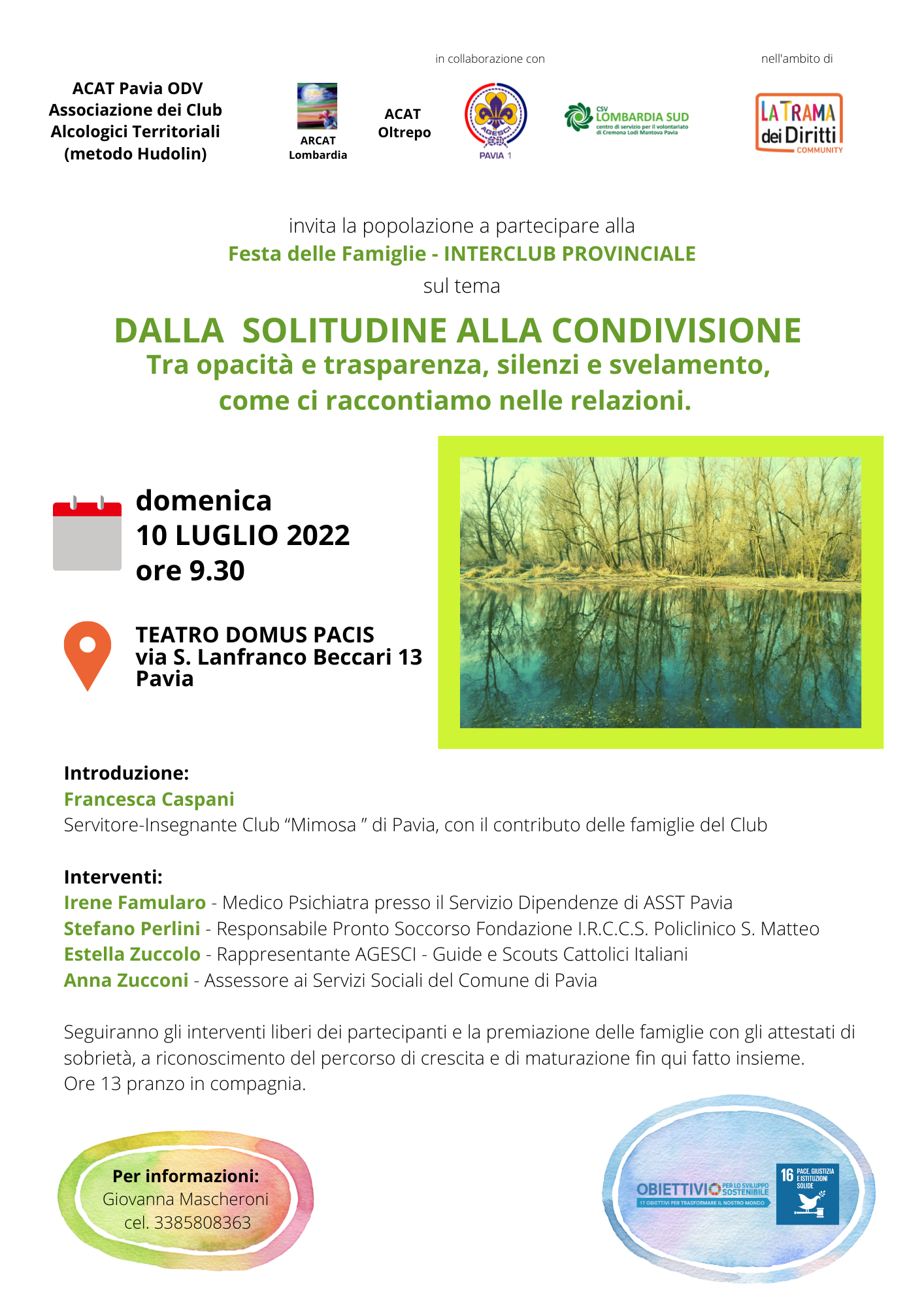 L’Associazione dei Club Alcolologici Territoriali di Pavia, (ACAT PAVIA ODV), insieme ad ACAT Oltrepo, organizza per domenica 10 luglio mattina un incontro, aperto a tutti, per festeggiare gli anni di sobrietà raggiunti dalle famiglie dei Club e per scambiarsi esperienze e progetti: la Festa delle famiglie o anche chiamato Interclub provinciale.