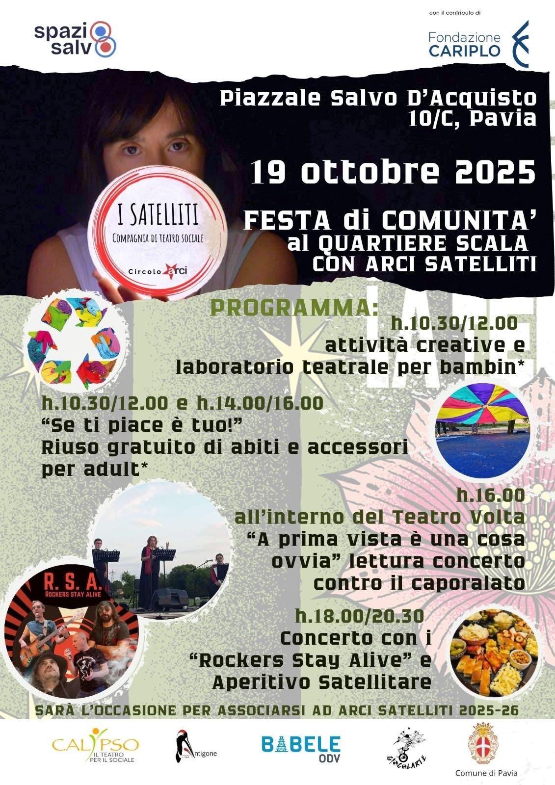 Una giornata all’insegna della condivisione, della creatività e della partecipazione collettiva: Arci Satelliti, con il sostegno di Fondazione Cariplo, organizza la Festa di Comunità del Quartiere Scala, un appuntamento aperto a tutte e tutti, per vivere insieme un’esperienza di socialità, arte e musica nel cuore di Pavia.