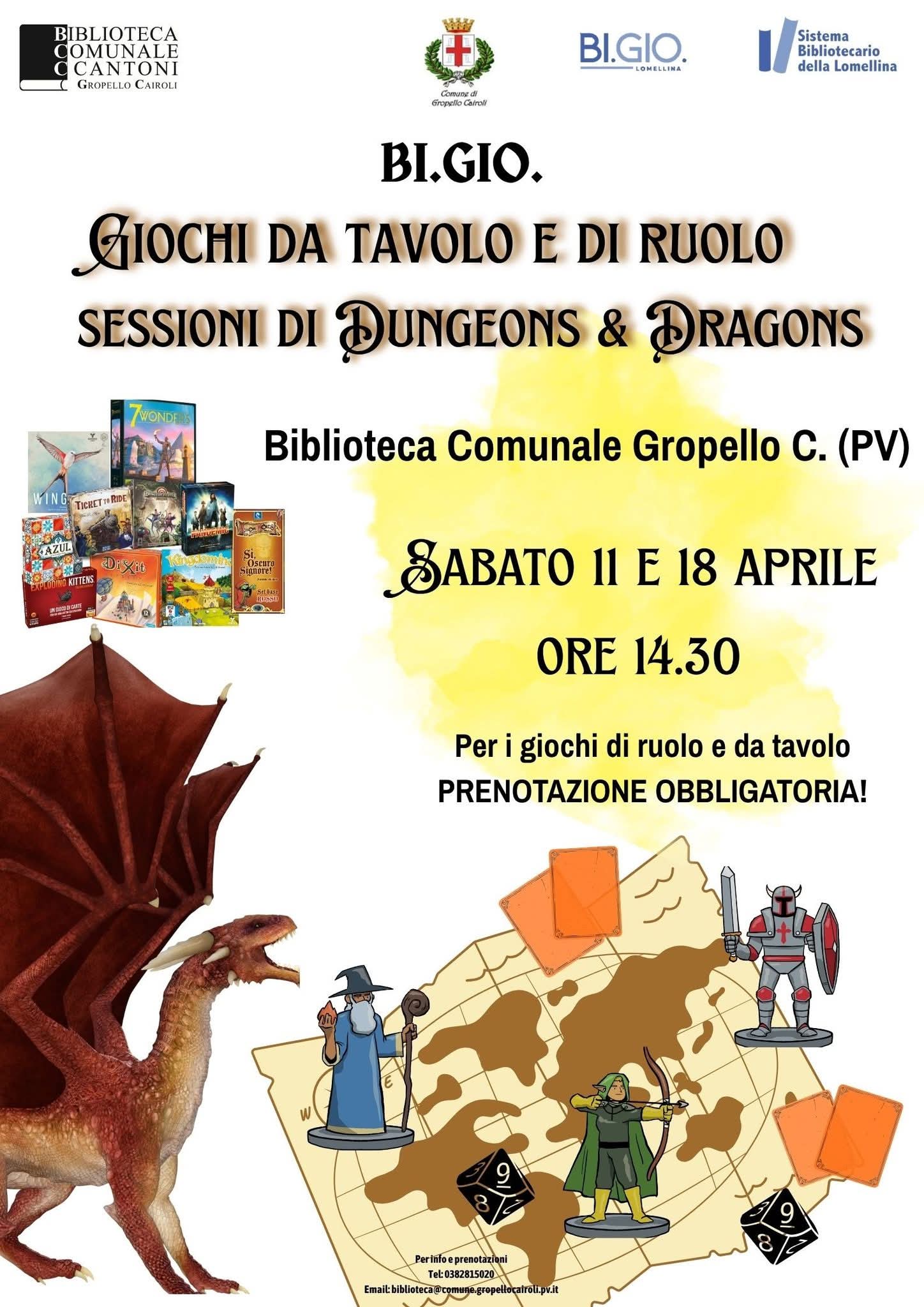 Sabato 18 aprile 2026 alle ore 14.30, la Biblioteca Comunale di Groppello (PV) ospita un nuovo appuntamento con giochi da tavolo e di ruolo, dedicato in particolare alle sessioni di Dungeons & Dragons.