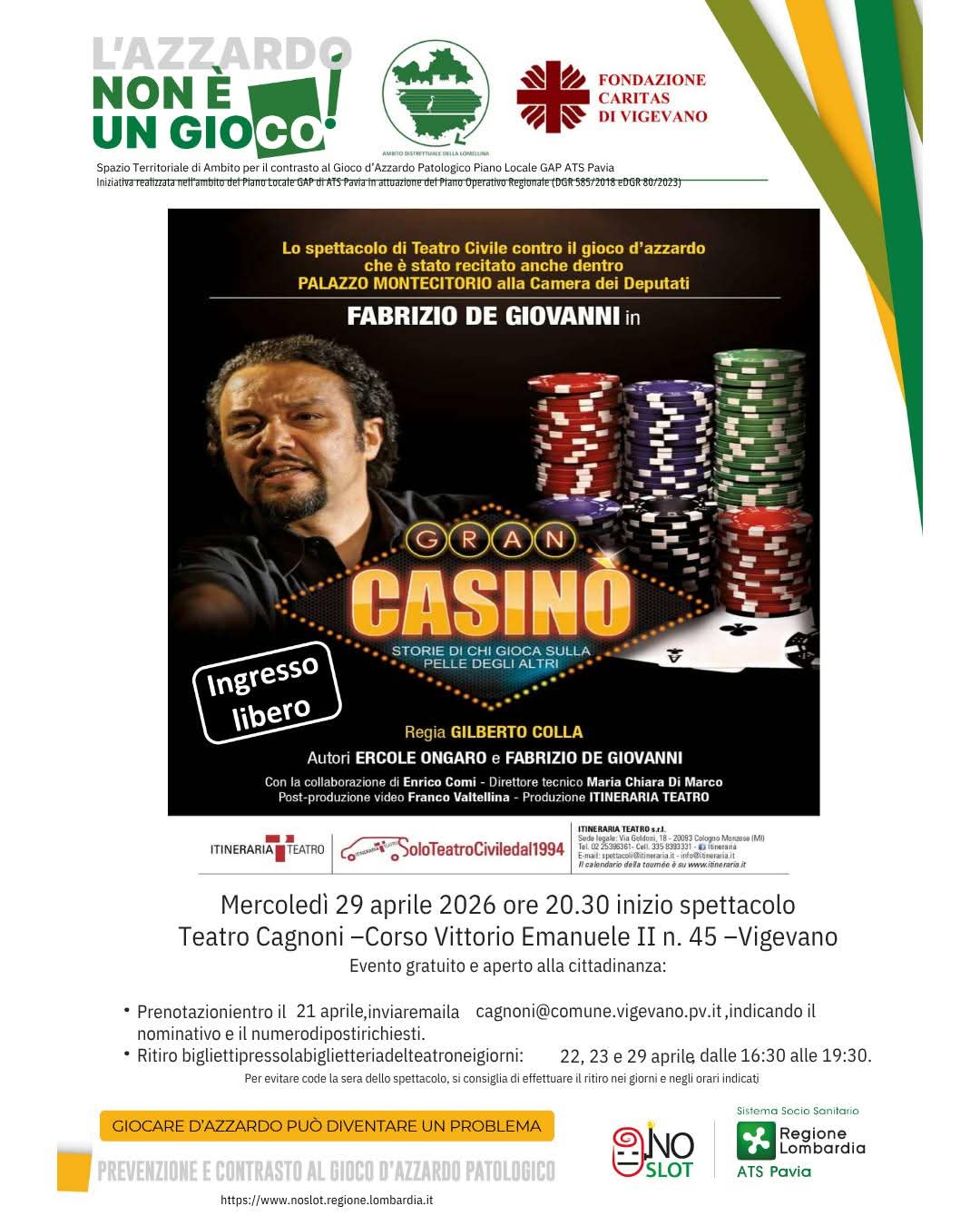 Mercoledì 29 aprile 2026 alle ore 20.30, il Teatro Cagnoni di Vigevano ospita Casino, uno spettacolo teatrale aperto alla cittadinanza che affronta il tema del gioco d’azzardo patologico.