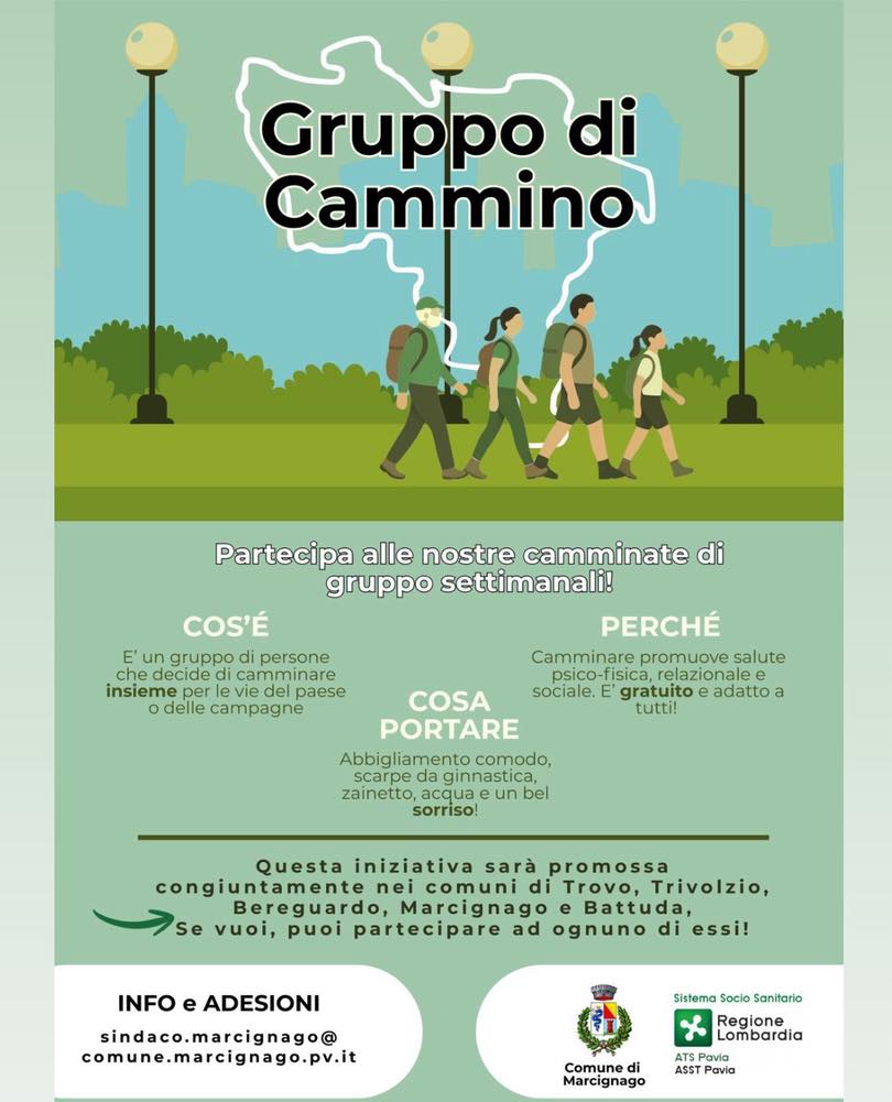 Nasce sul territorio un nuovo Gruppo di Cammino, un’iniziativa promossa congiuntamente dai Comuni di Marcignago, Trovo, Trivolzio, Bereguardo e Battuda, in collaborazione con ATS Pavia, con l’obiettivo di favorire salute, movimento e socialità.